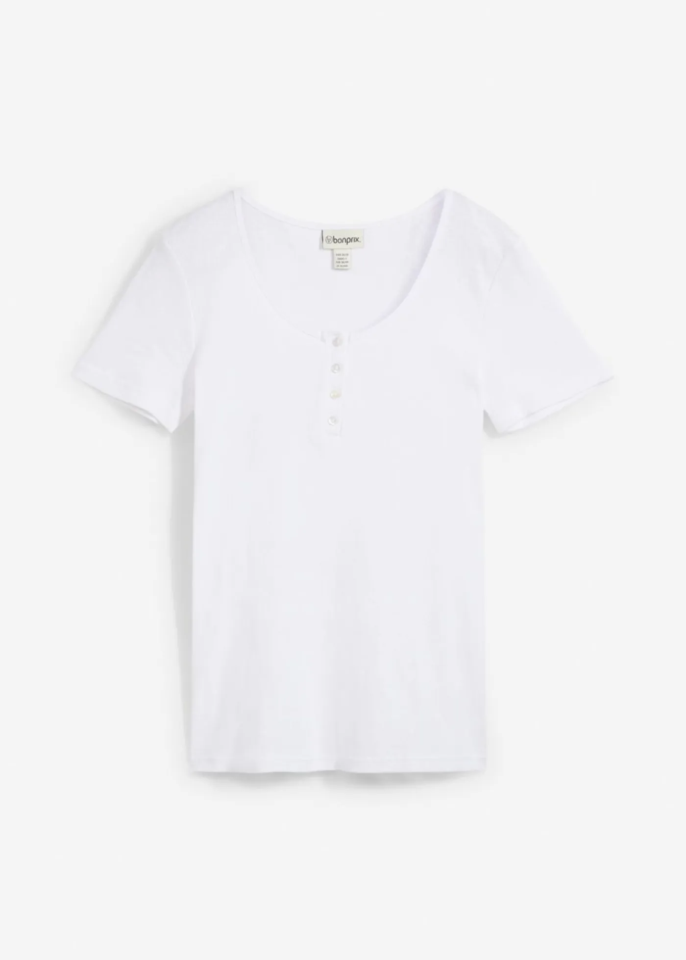 Camiseta básica con botones. Largo de aprox. 66 cm en talla 40/42. Se puede lavar a máquina.
