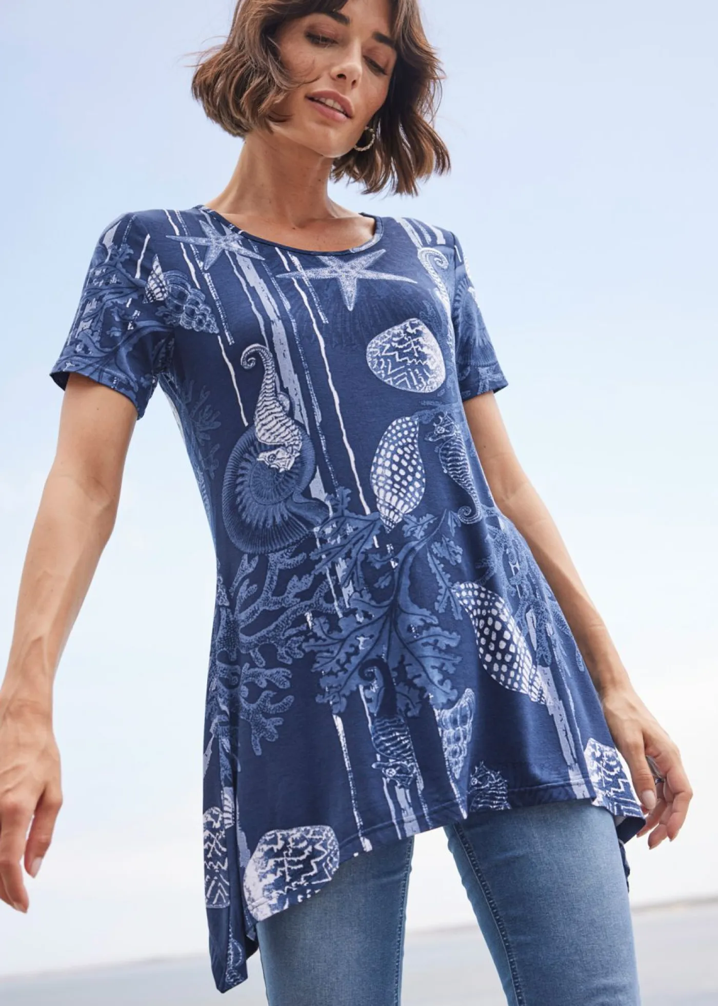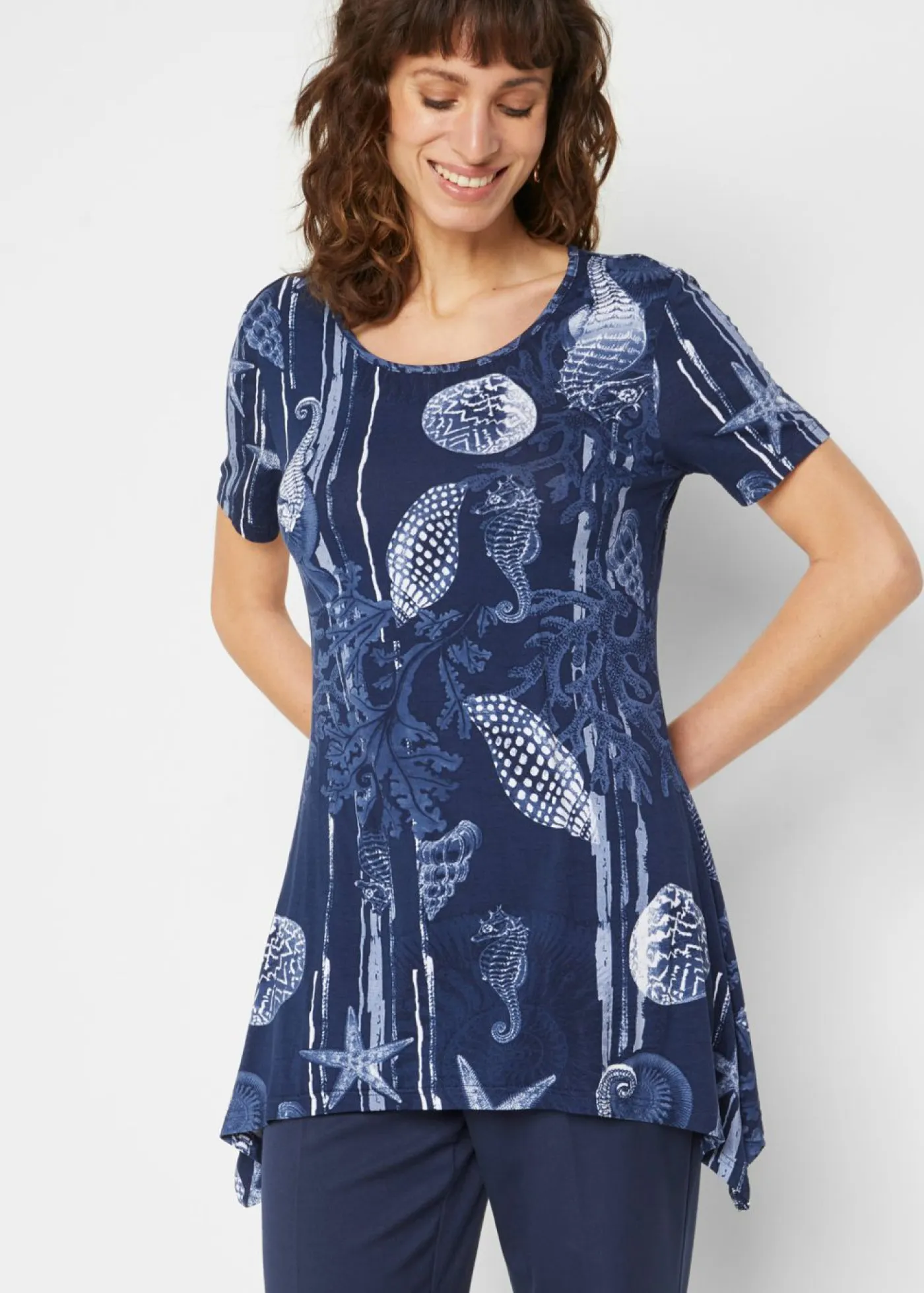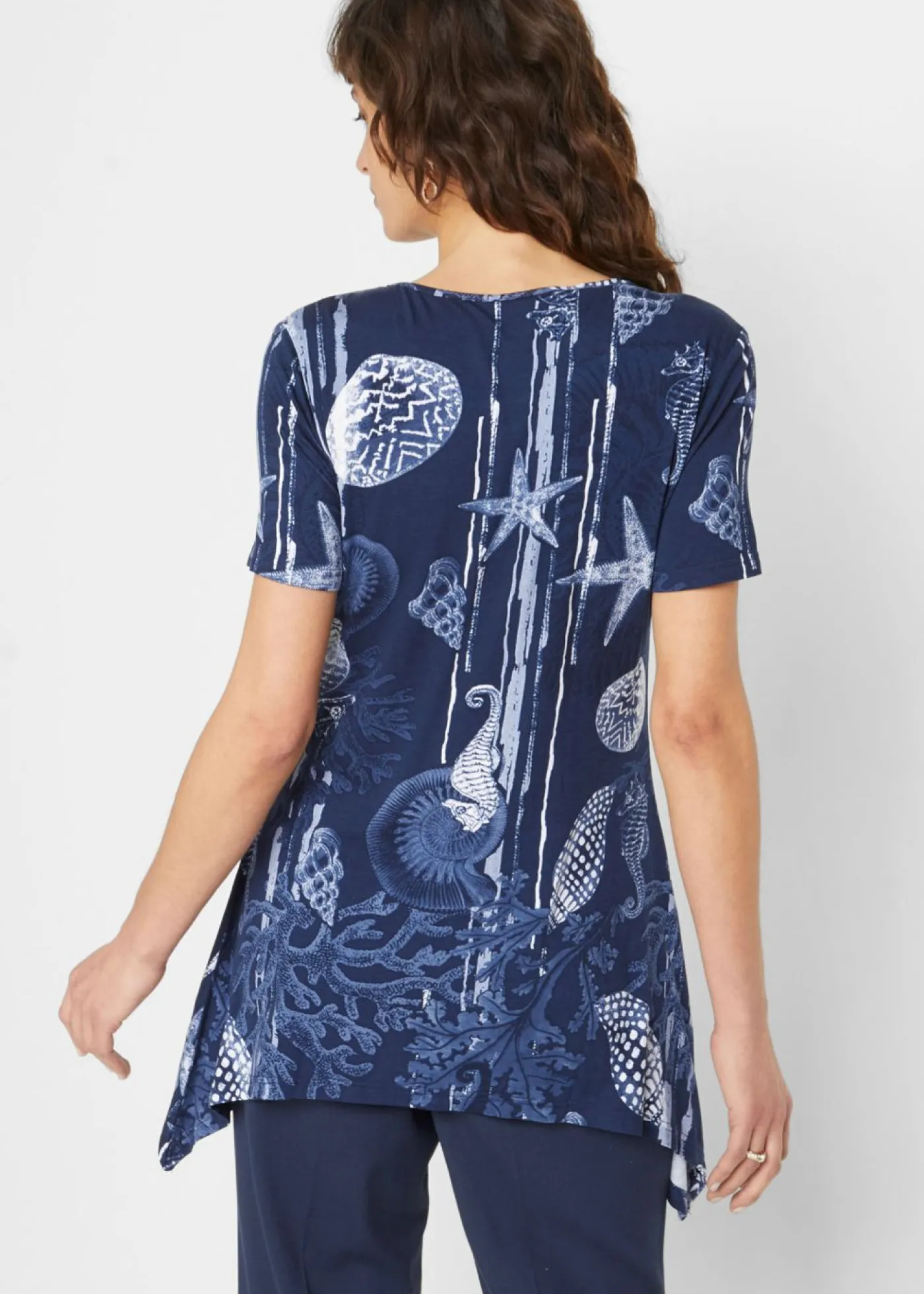 Camiseta larga con bajo irregular y manga corta. Largo de aprox. 72 cm (talla 36/38) a aprox. 82 cm (talla 56/58). Se puede lavar a máquina.