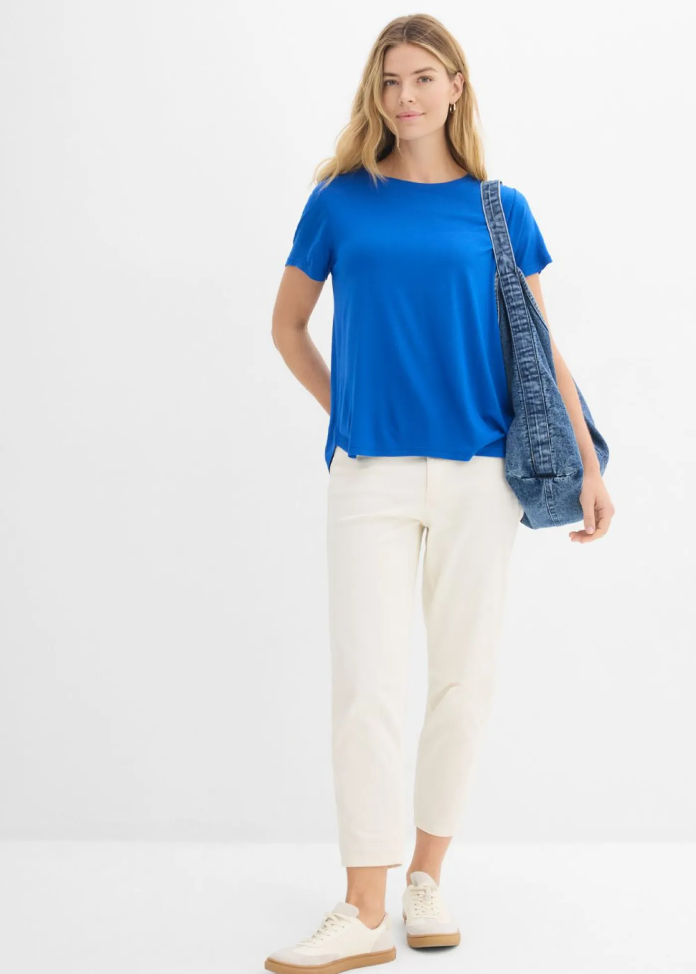Moderna camiseta larga, con dobladillo redondeado y cuello redondo.