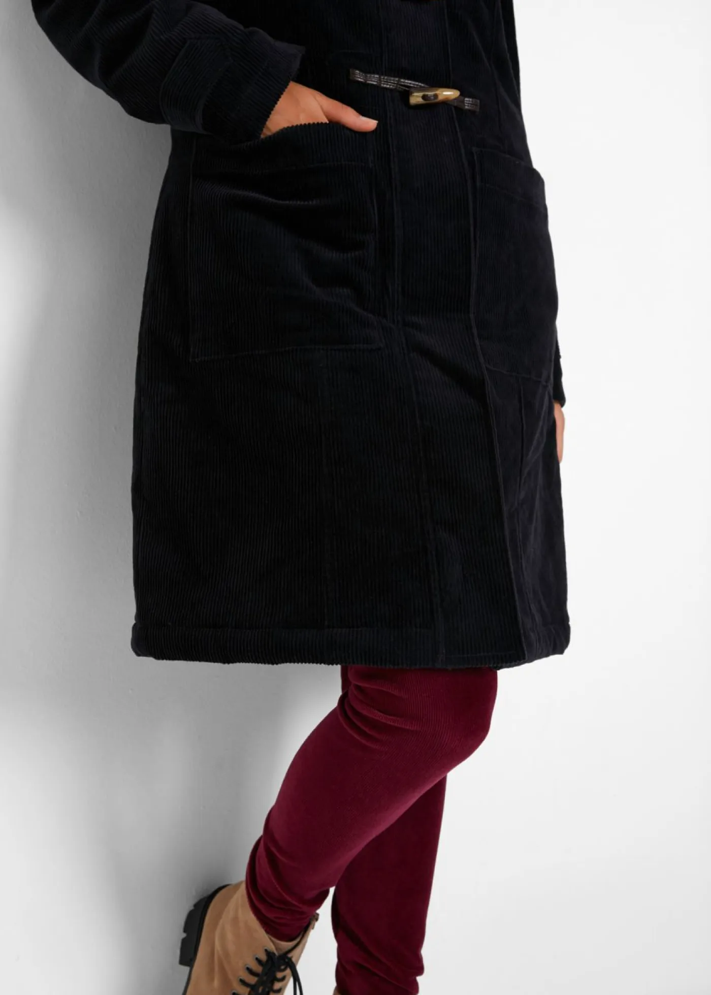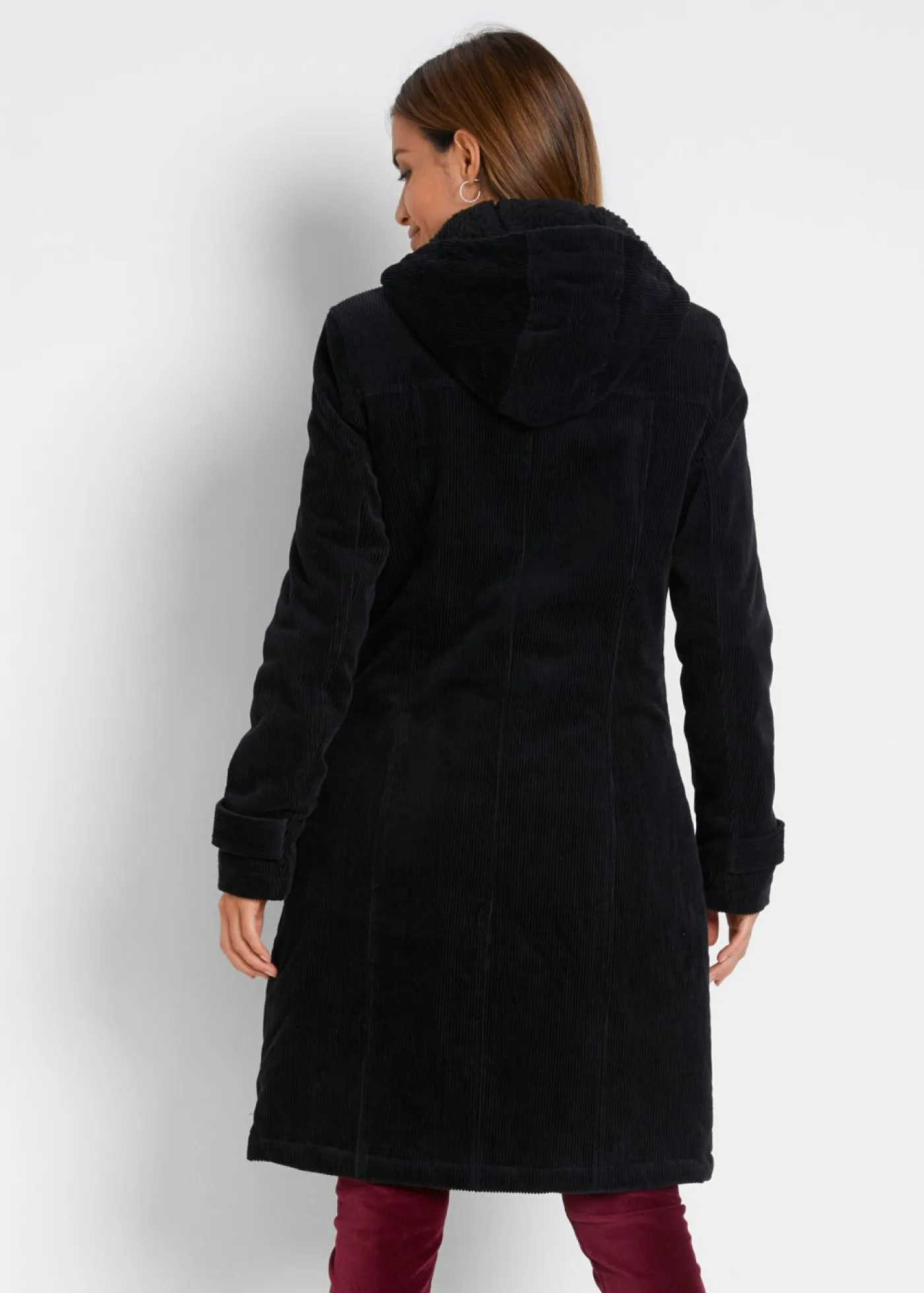 Capa forrado de pana con capucha y botones tipo trenca. Largo de aprox. 96 cm en todas las tallas. Se puede lavar a máquina.