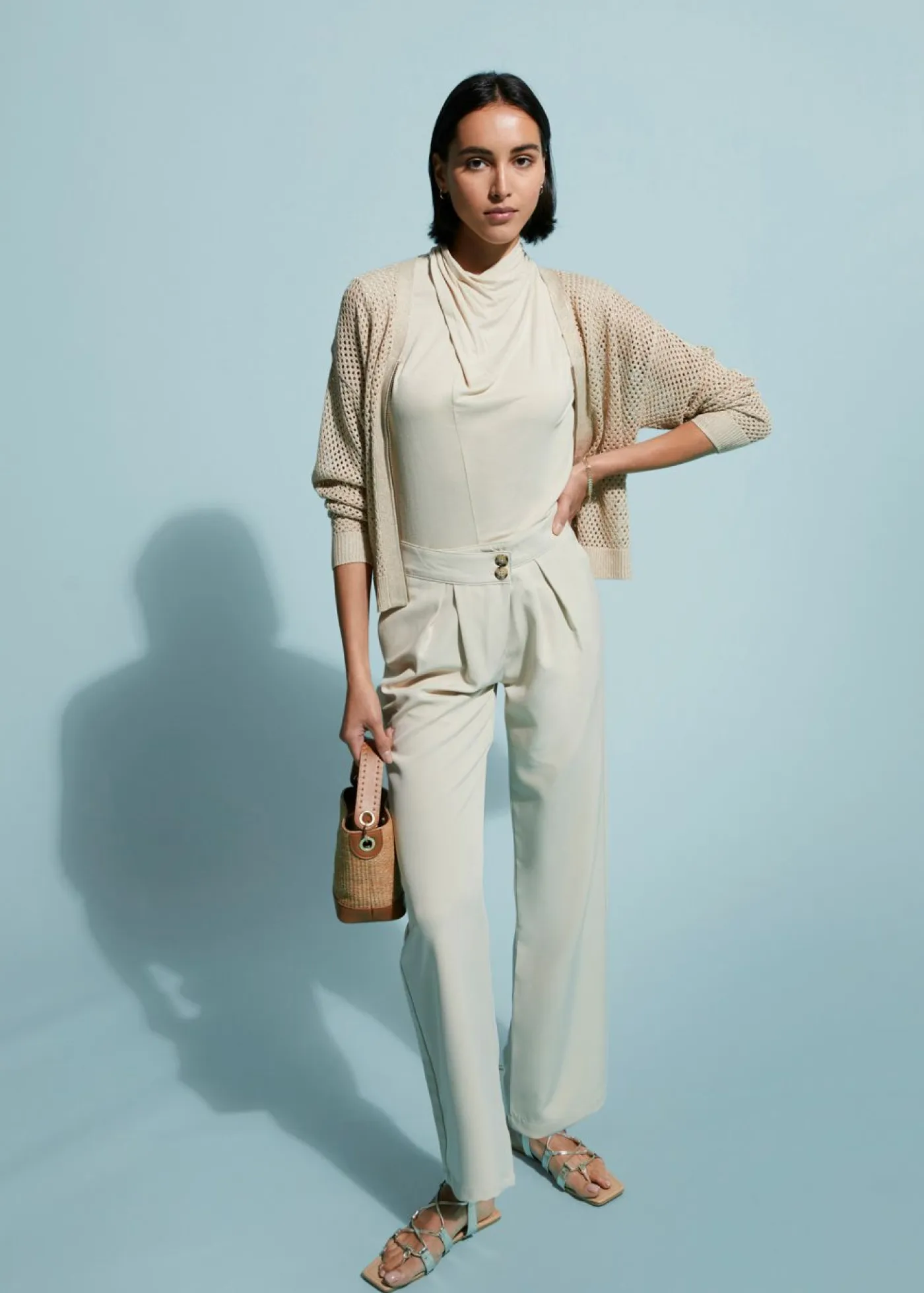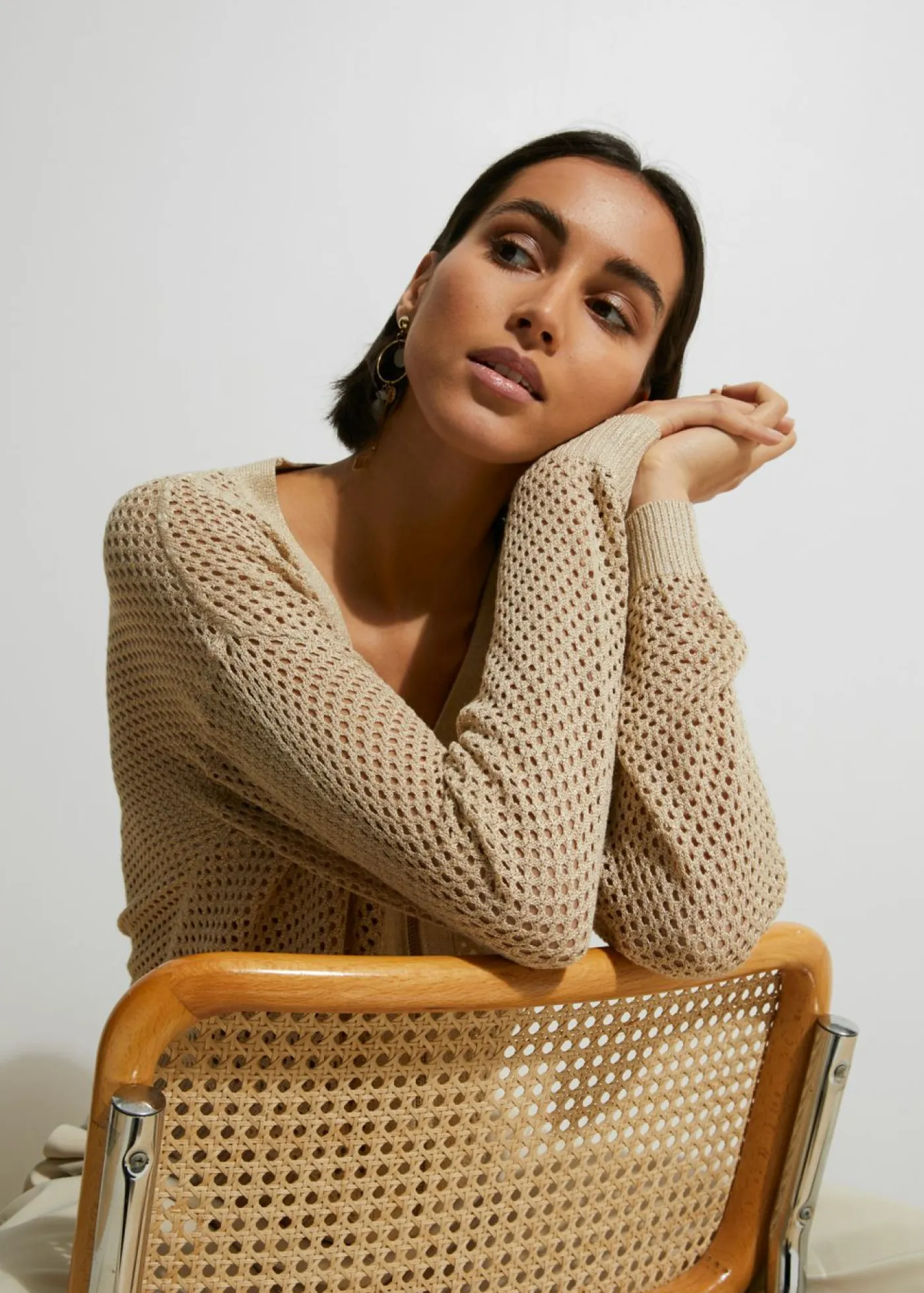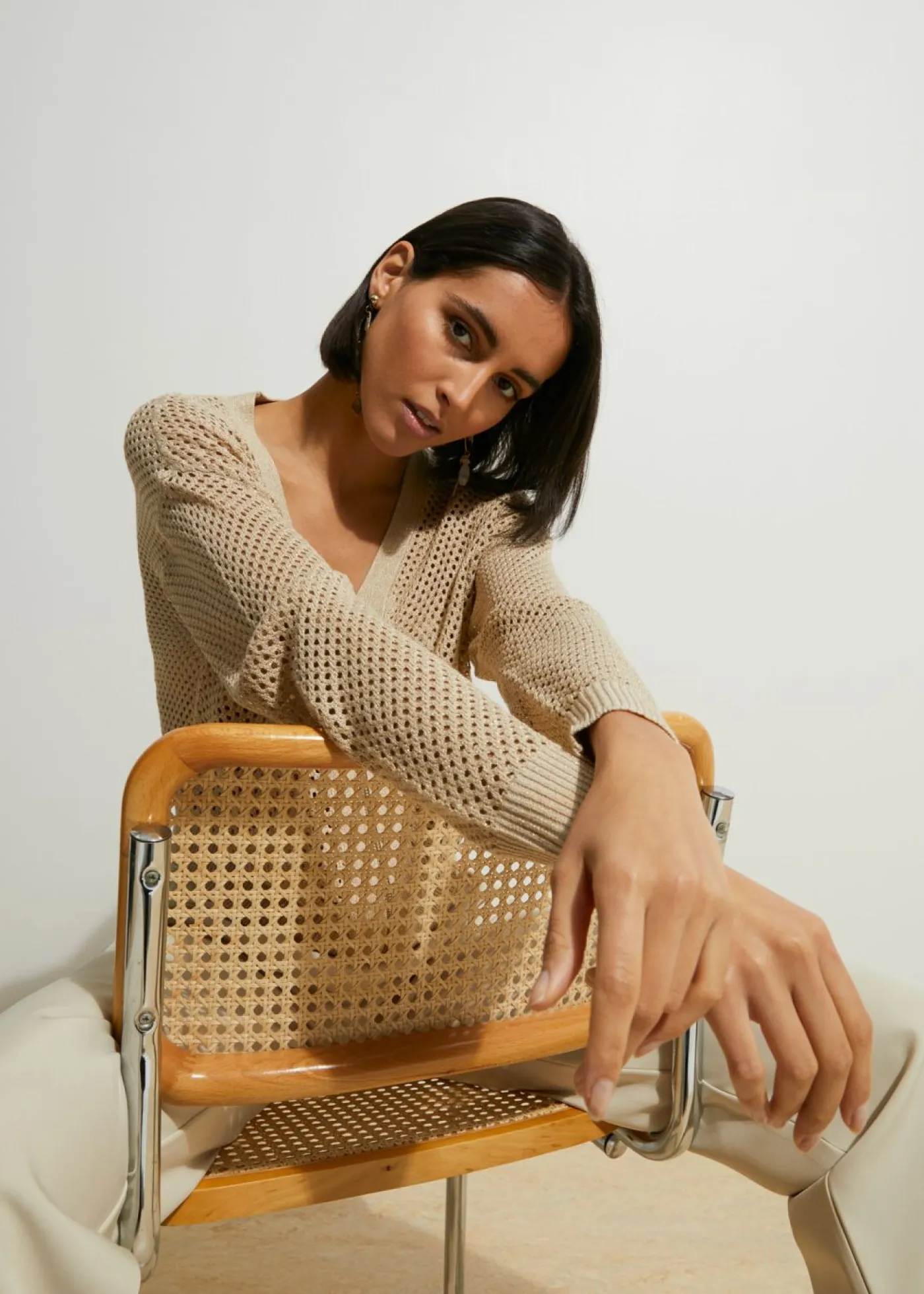 Elegante chaqueta corta de punto con cremallera en la parte delantera.