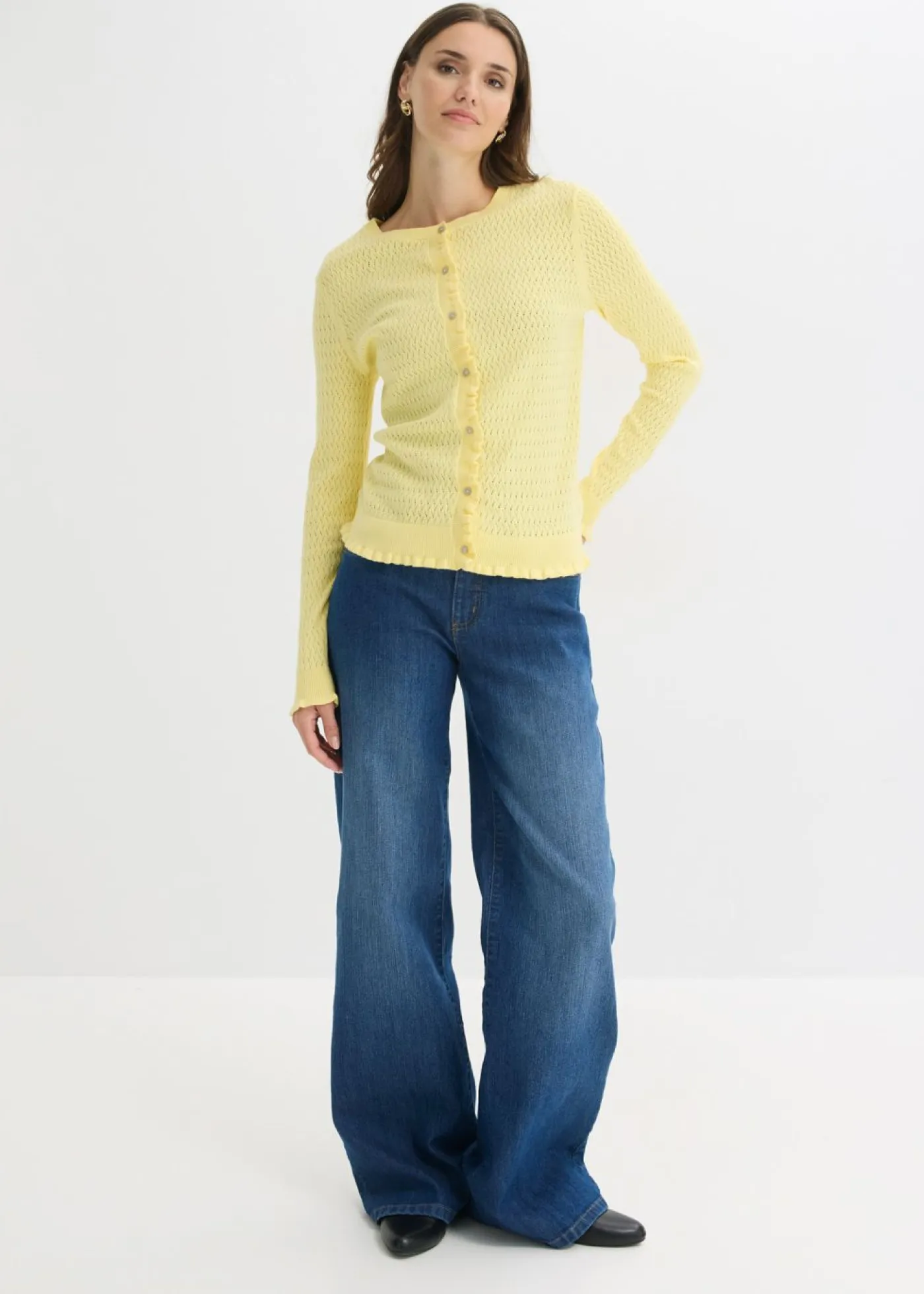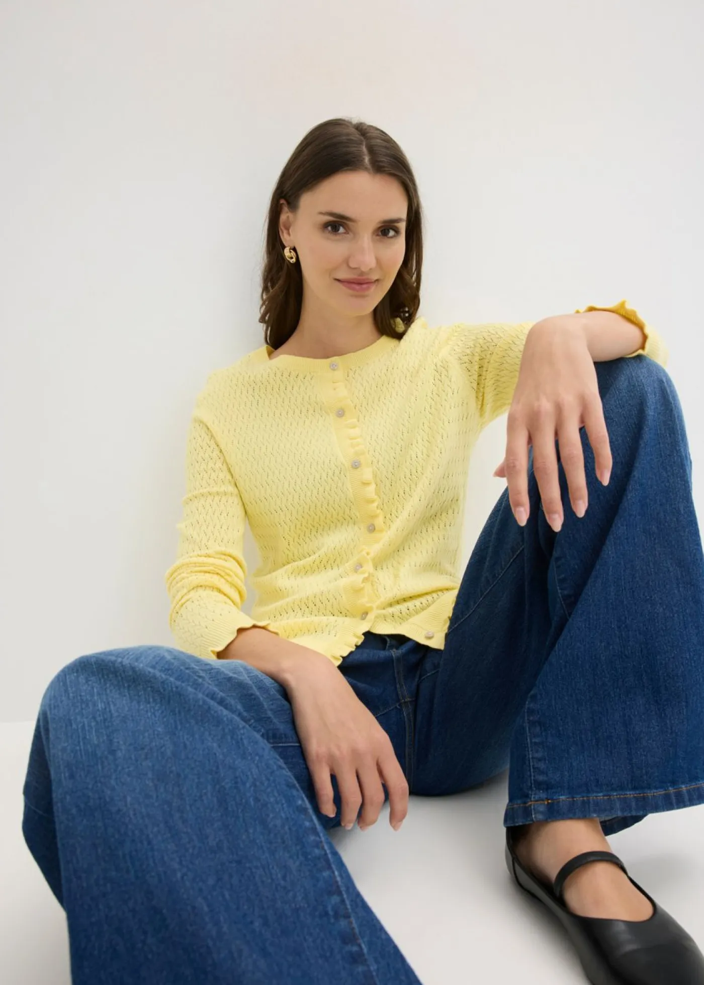 Moderno cárdigan con cierre de botones y volantes pequeños.