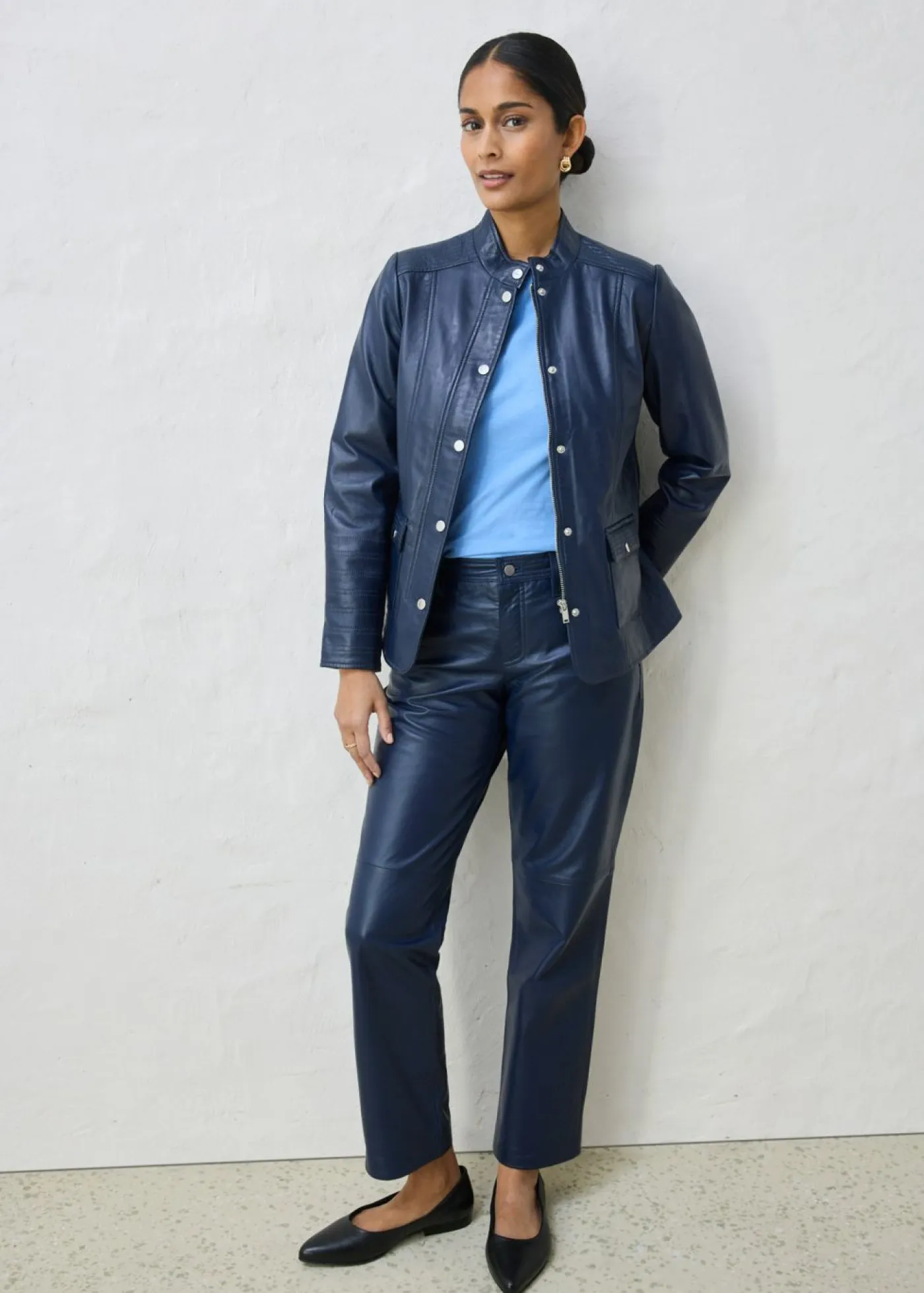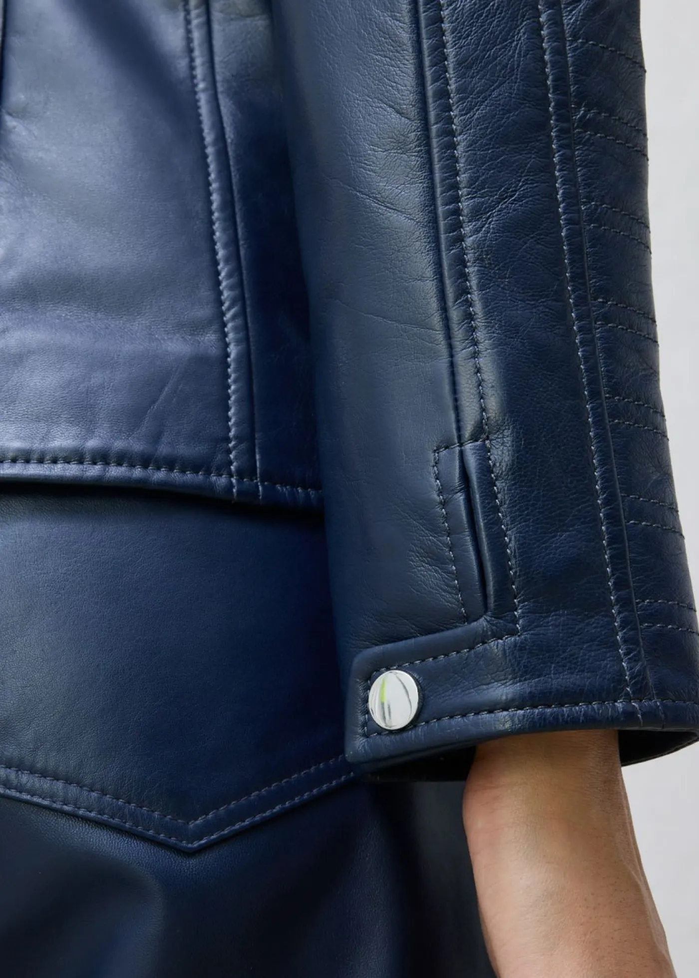 Chaqueta de cuero clásica con cuello alto y detalles elaborados. El borrego es un cuero noble y de calidad que sorprende por su suavidad y durabilidad. Las irregularidades naturales le dan carácter al cuero de alta calidad y hacen que cada artículo sea único. Nuestra fina napa de cordero tiene un curtido vegetal.