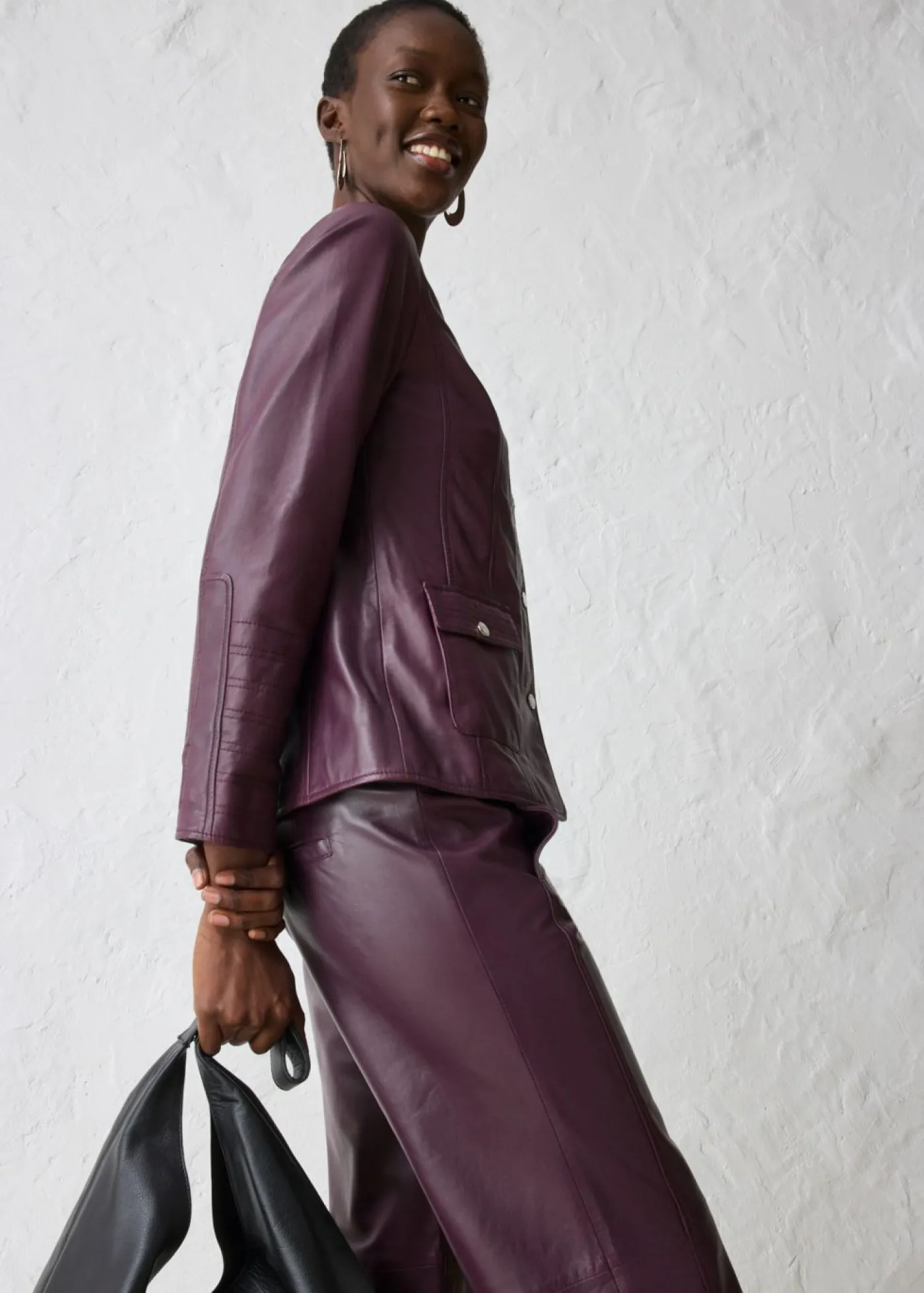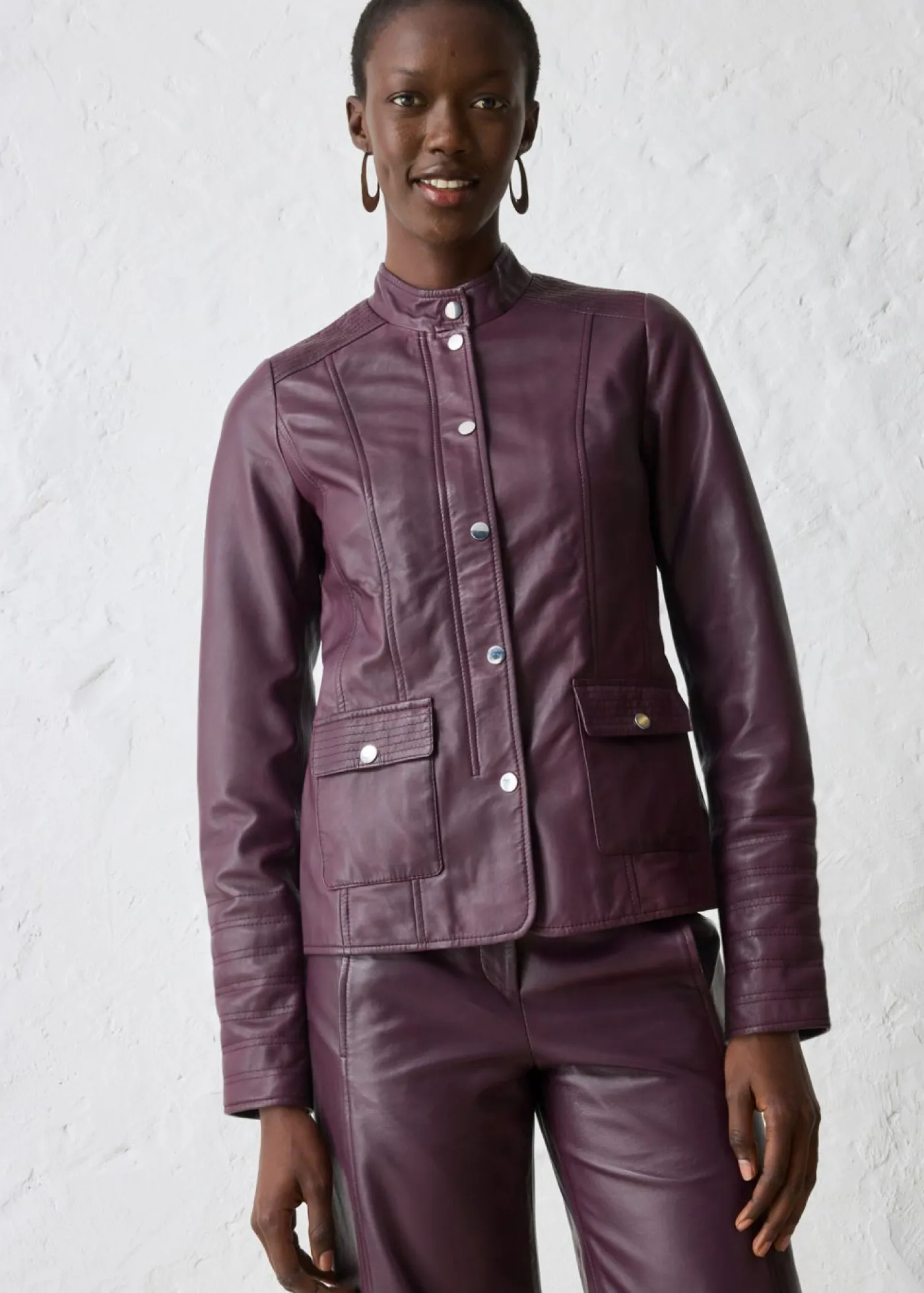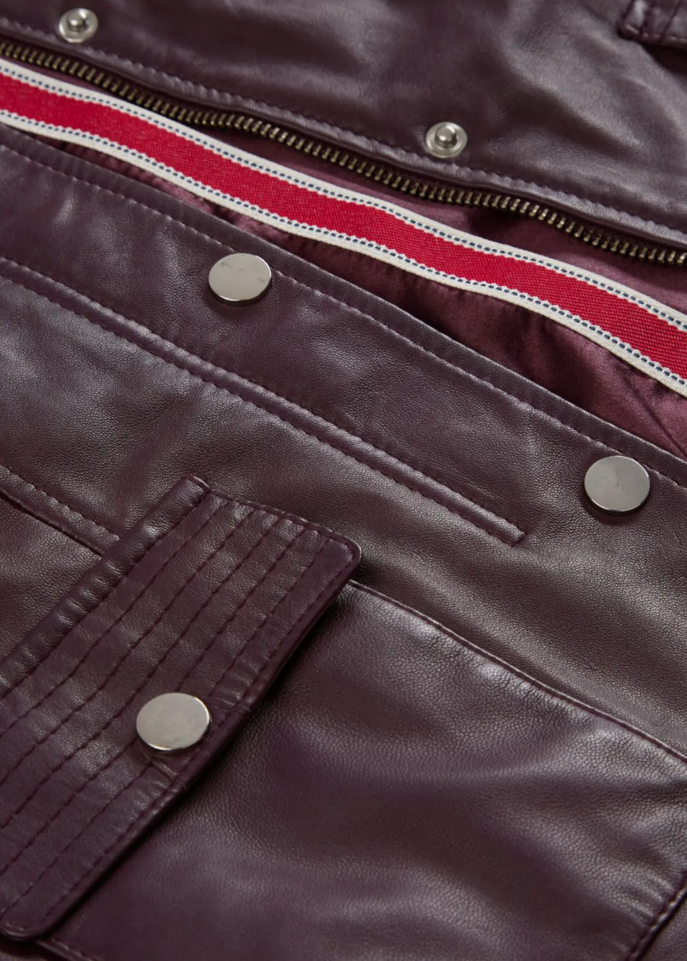 Chaqueta de cuero clásica con cuello alto y detalles elaborados. El borrego es un cuero noble y de calidad que sorprende por su suavidad y durabilidad. Las irregularidades naturales le dan carácter al cuero de alta calidad y hacen que cada artículo sea único. Nuestra fina napa de cordero tiene un curtido vegetal.