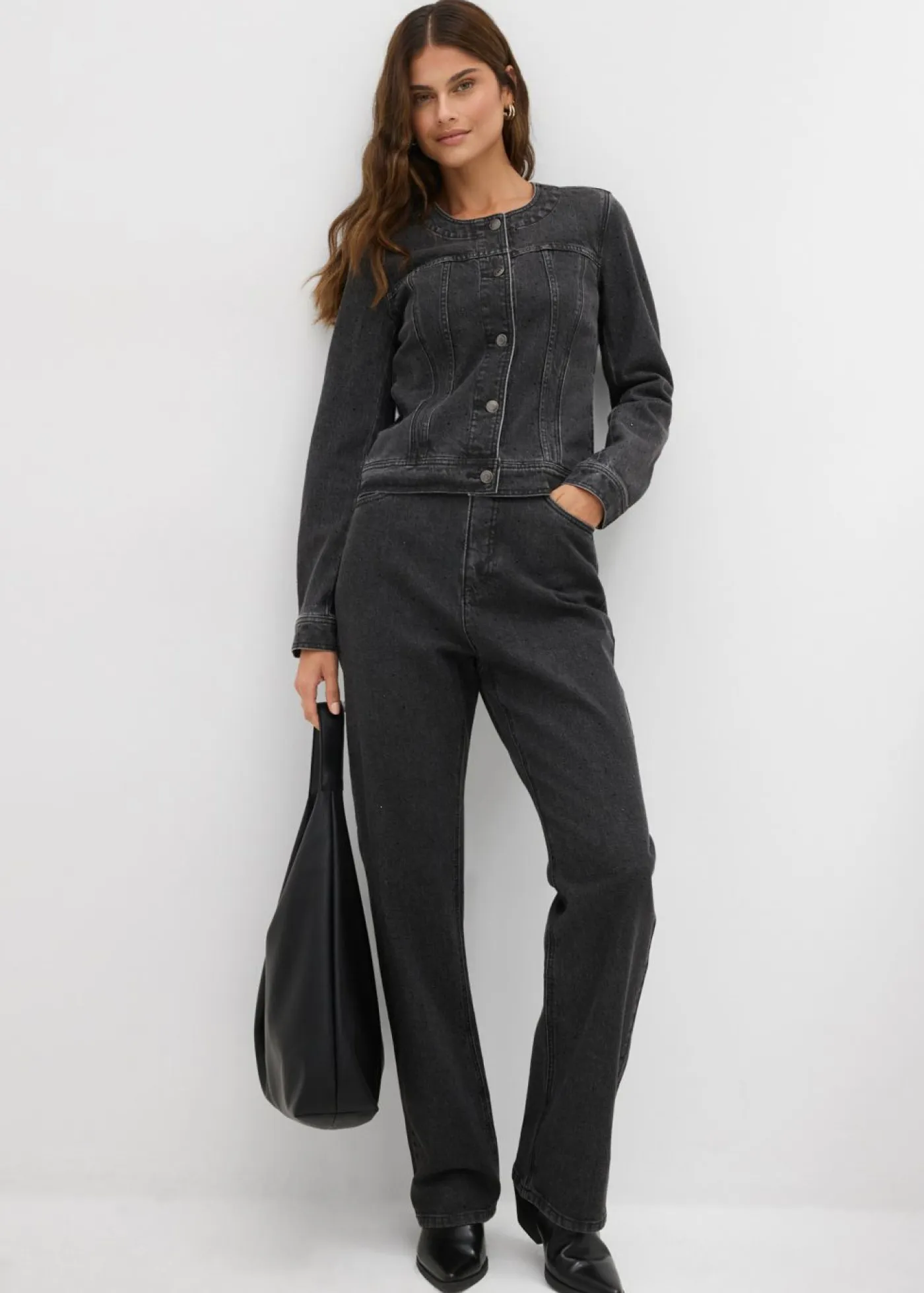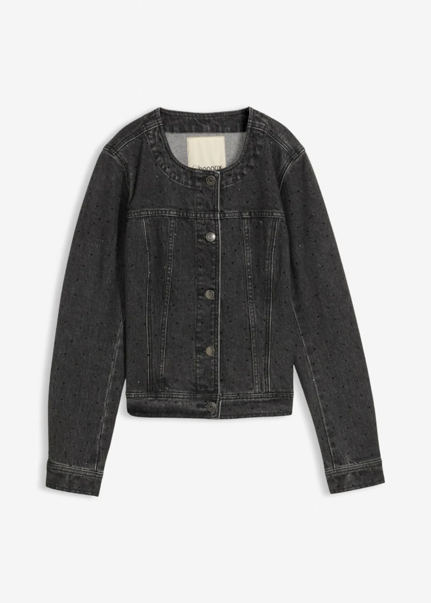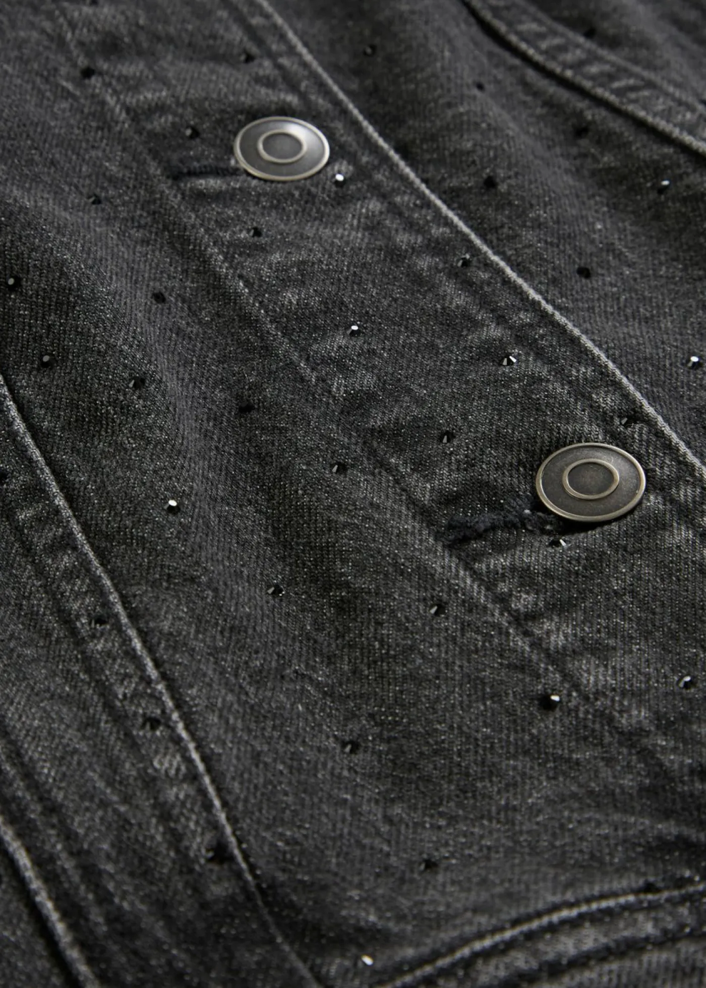 Cazadora vaquera con piedras brillantes y corte cuadrado. Largo total de aprox. 56 cm en talla 42.