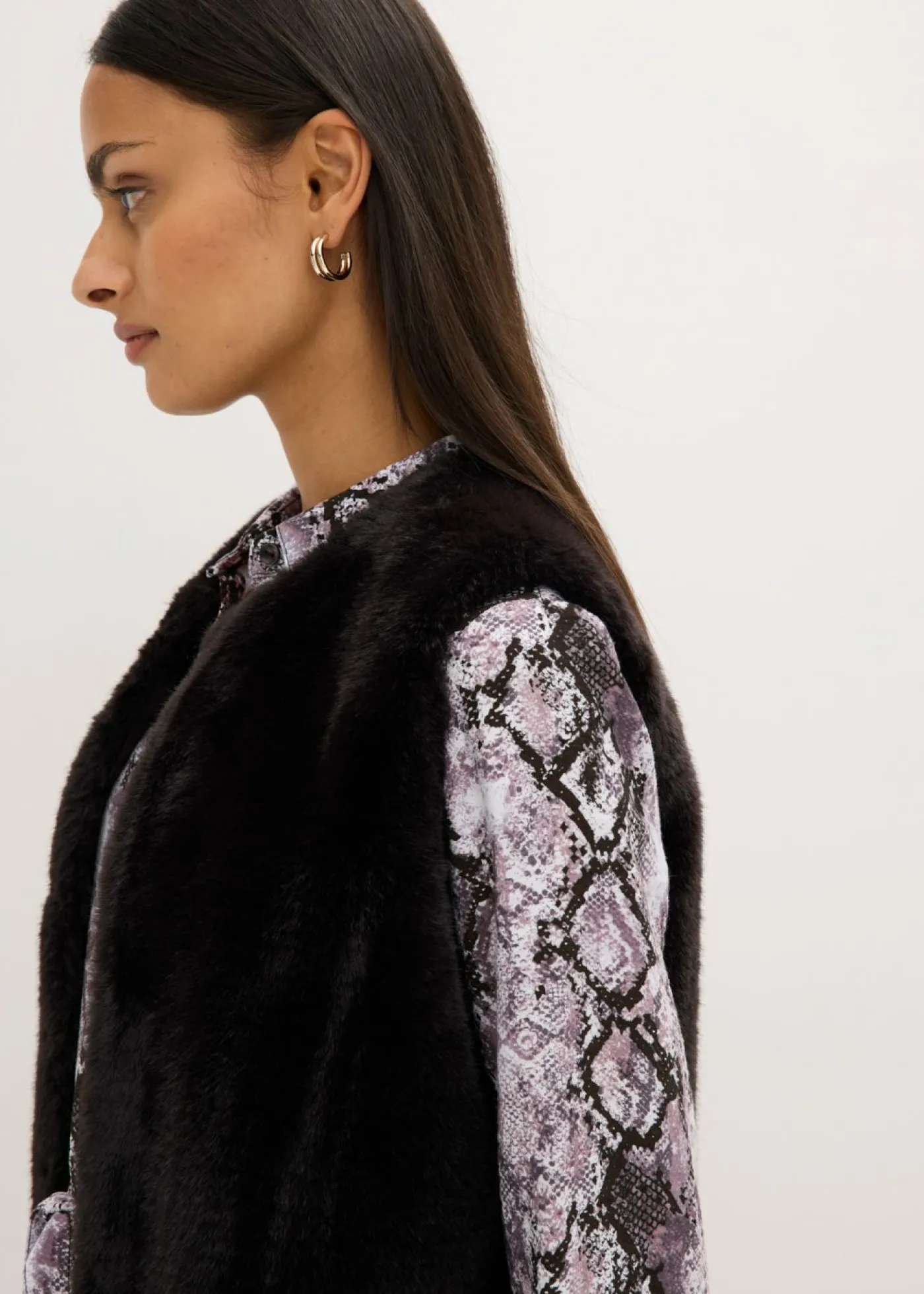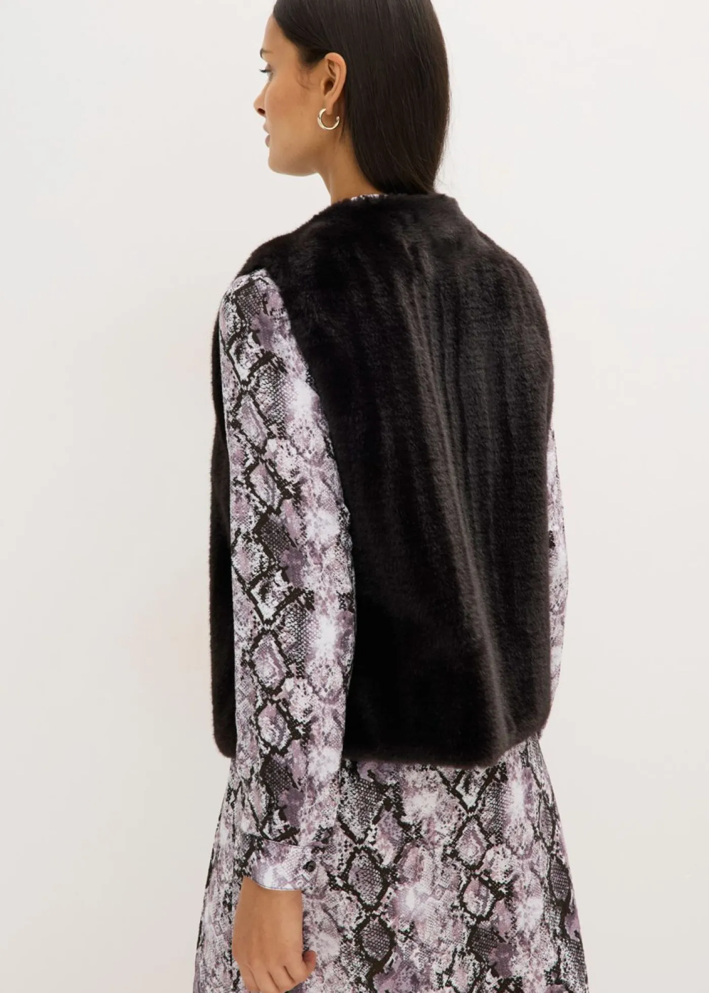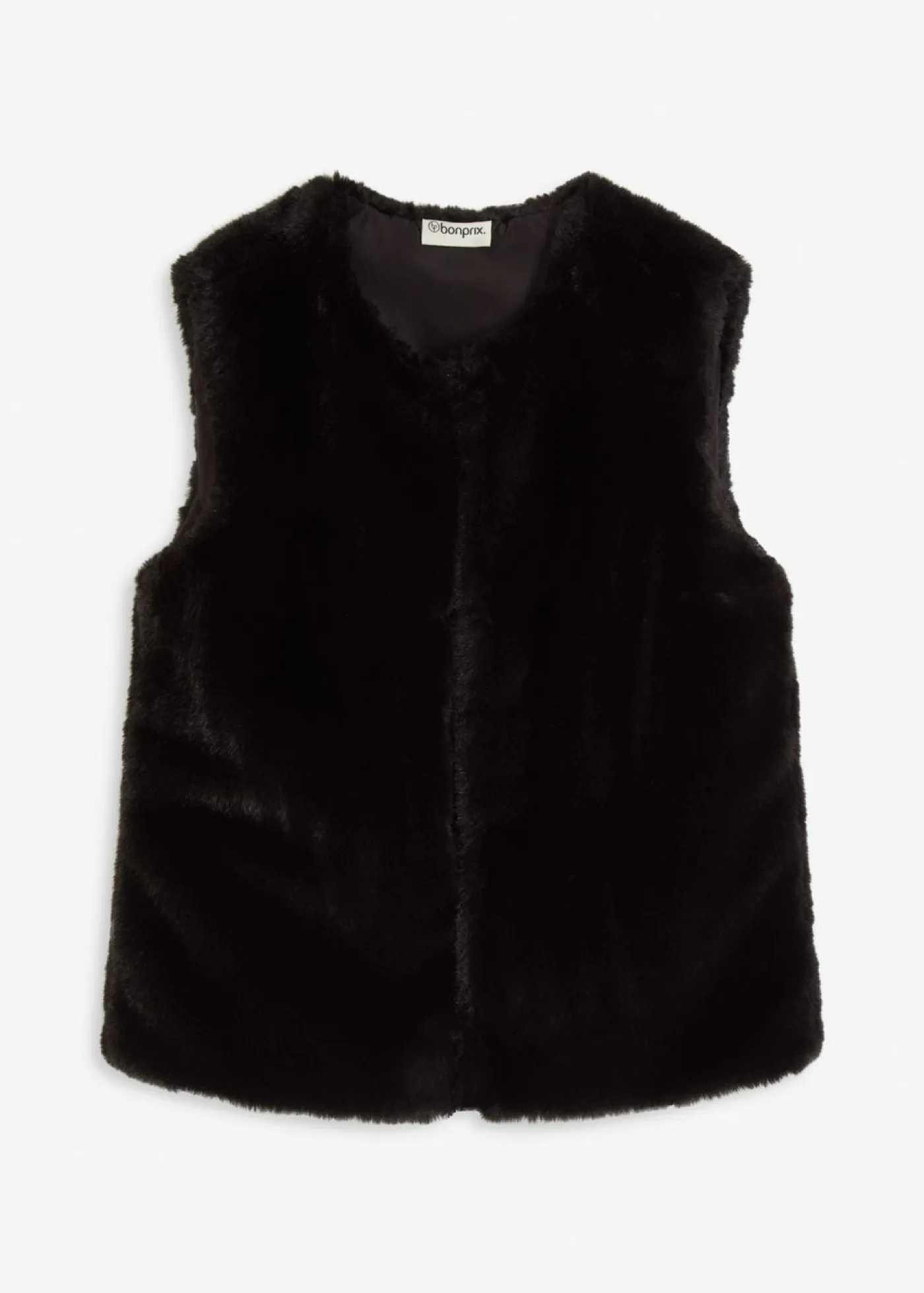 Moderno chaleco de pelo sintético con cierre de ganchos y ojales en la parte delantera.