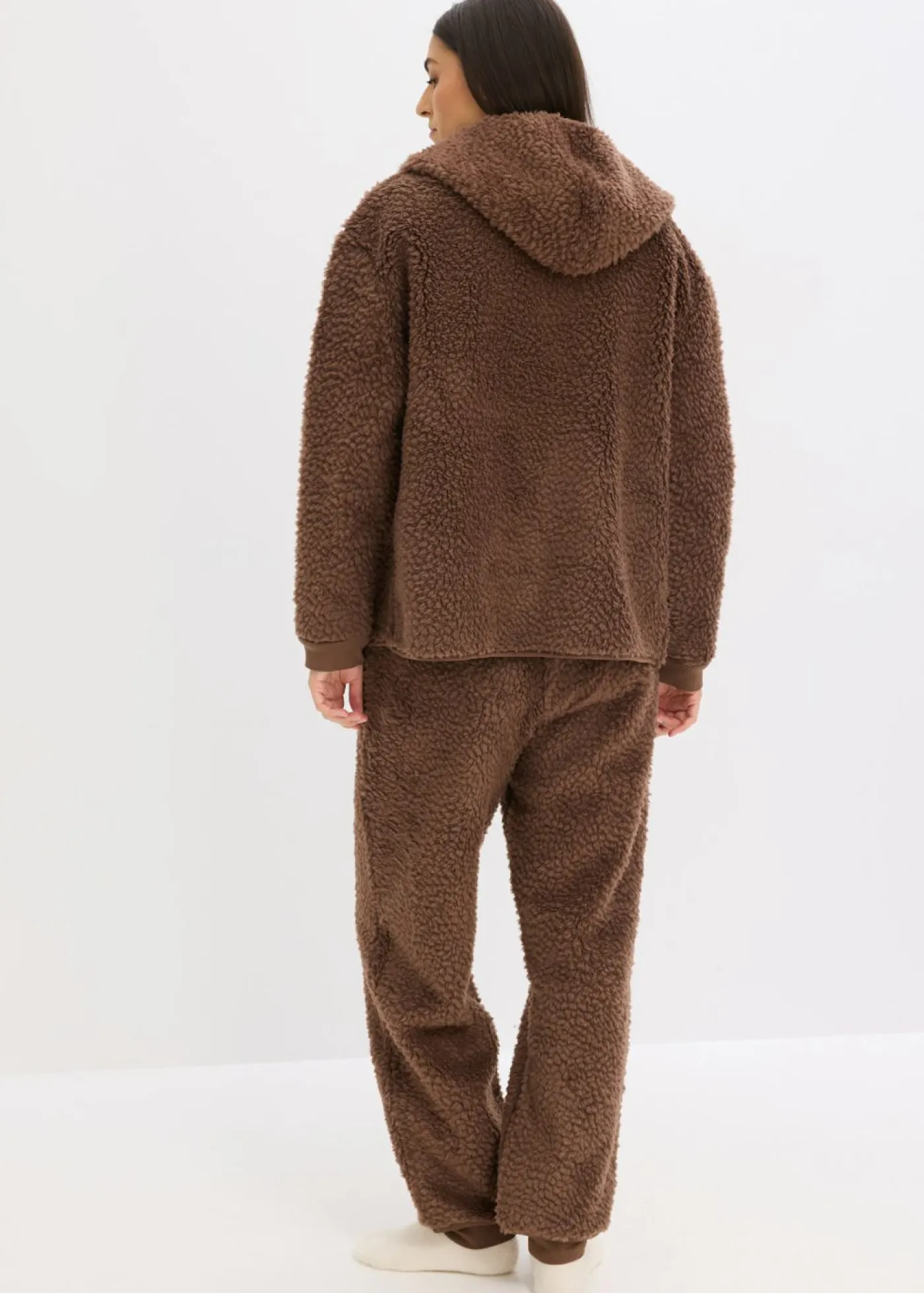 Moderno chándal de felpa con chaqueta abierta con capucha y pantalón con bolsillos.