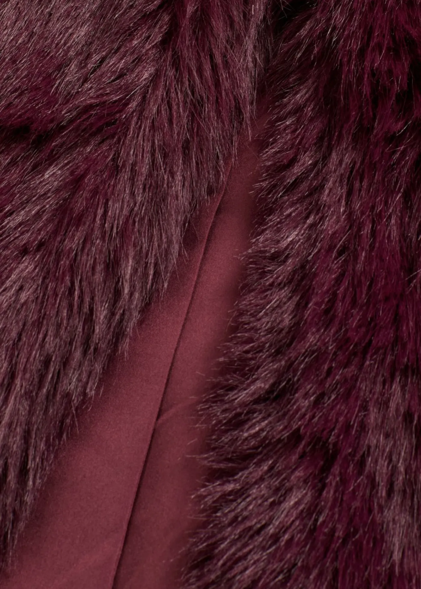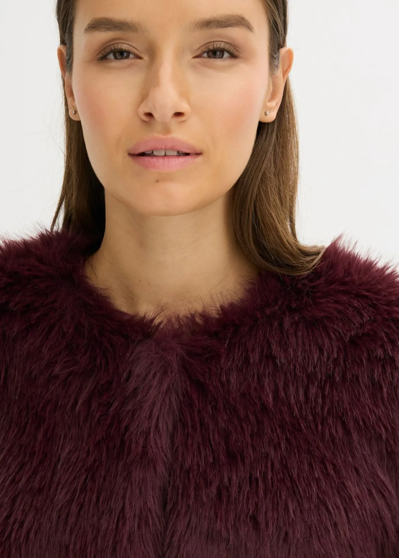 Chaqueta corta de pelo sintético a la moda con cuello redondo y cierre de gancho y ojal en la parte delantera.