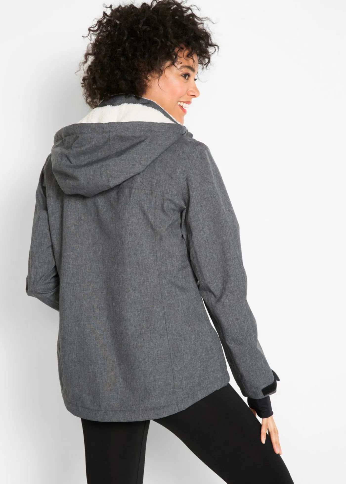 Atractiva chaqueta de lluvia con bolsillos con cremallera. Con capucha desmontable, interior de forro polar, cordón en el dobladillo para ajustar la anchura, bolsillo interior con cordón, orificios para los pulgares, más largo en la parte posterior que en la delantera. Columna de agua de 3000 mm. Largo de aprox. 74 cm en talla 42.