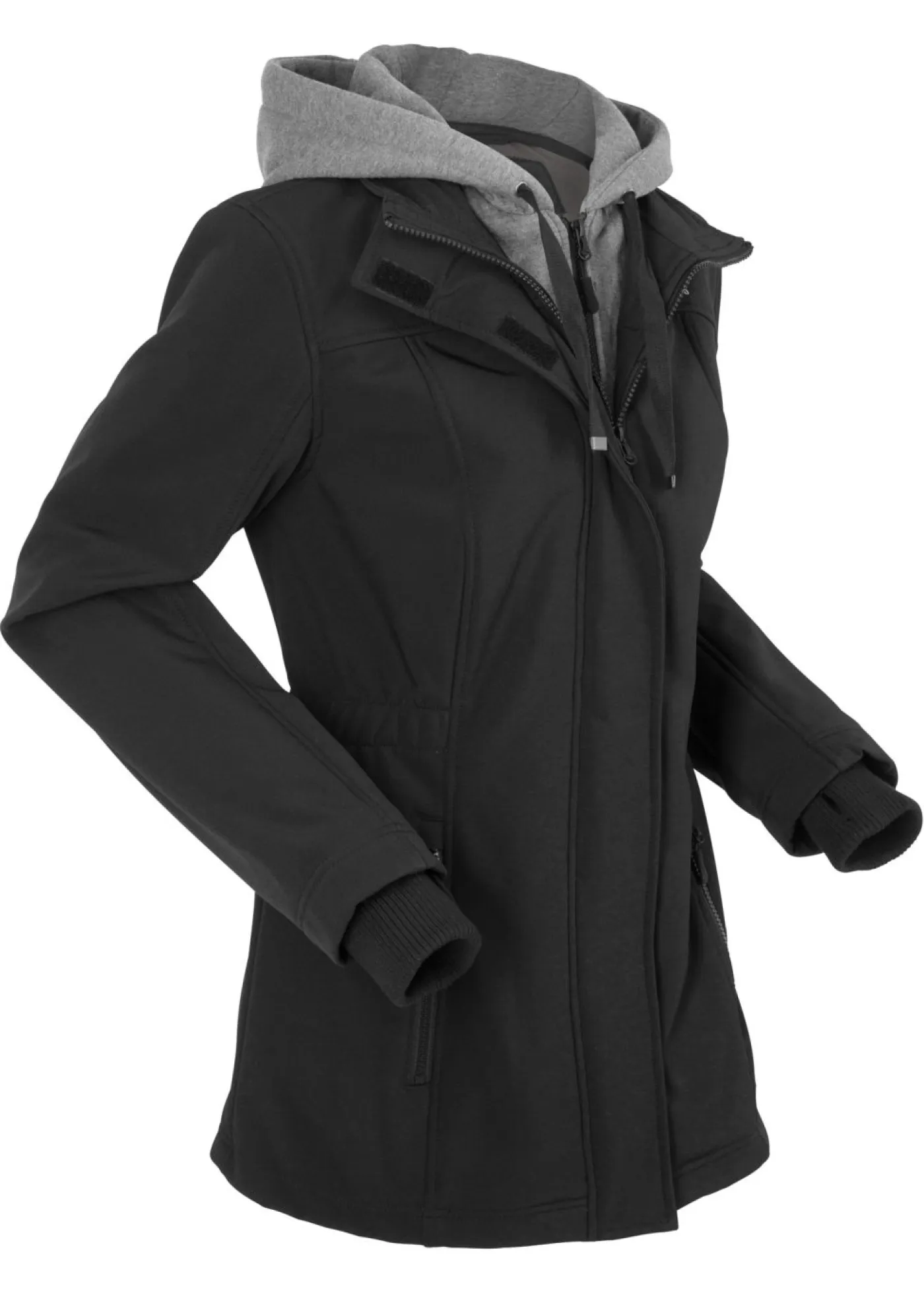 Chaqueta de entretiempo deportiva de softshell con capucha tipo sudadera. Con capucha de sudadera e inserto de sudadera, inserto elástico en la cintura, cremallera de 2 vías, bolsillos con cremalleras, orificios para los pulgares, chaqueta con rugosidad marcada en el interior. Largo de aprox. 78 cm en talla 42.