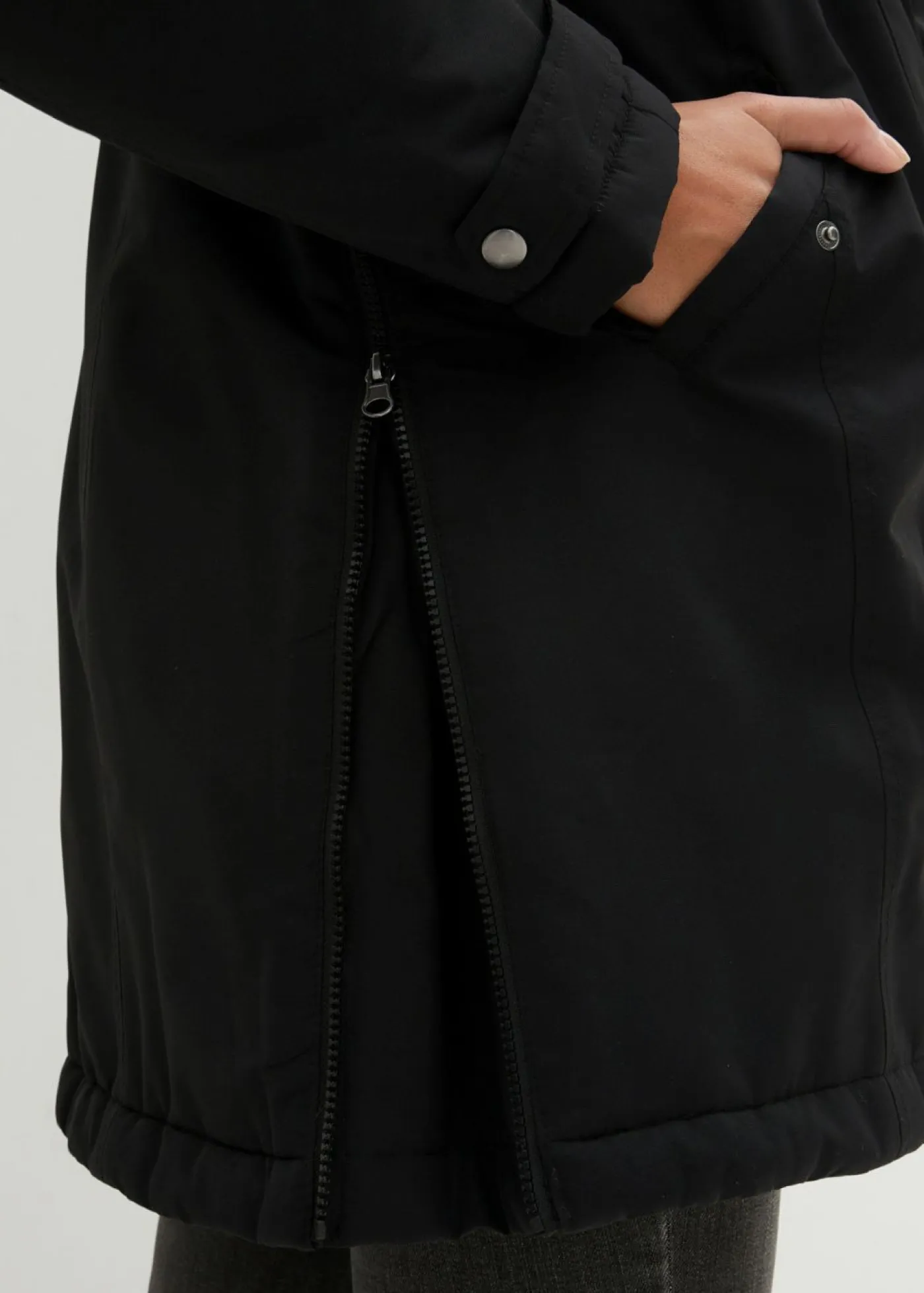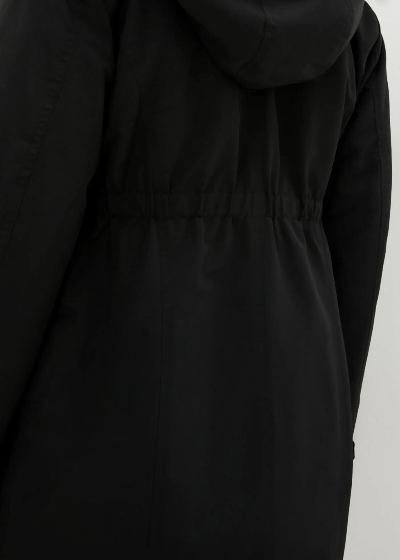 Práctica chaqueta premamá con función de porteo y pasacordón. Esta cálida chaqueta premamá es perfecta para las estaciones más frías. Con el inserto para bebés, el pequeño queda protegido del viento y la lluvia. Incluso antes del nacimiento, la práctica chaqueta se puede usar en todos los meses de embarazo. La chaqueta se puede cerrar con una cremallera y botones en la parte delantera, y se puede ajustar en la cintura y la cintura con cordón. El cuello de pelo sintético en la capucha es extraíble. El inserto portabebés es solo para protección, no tiene función de porteo.