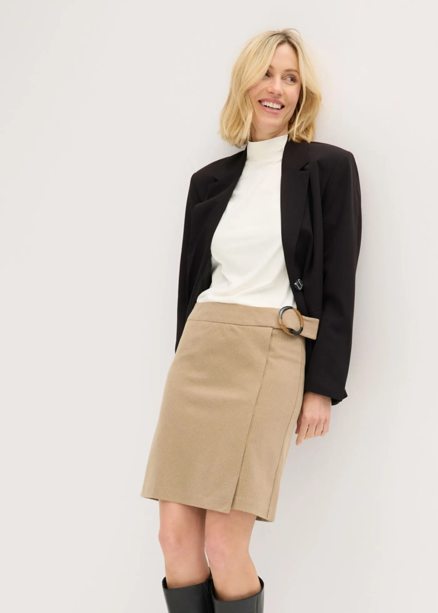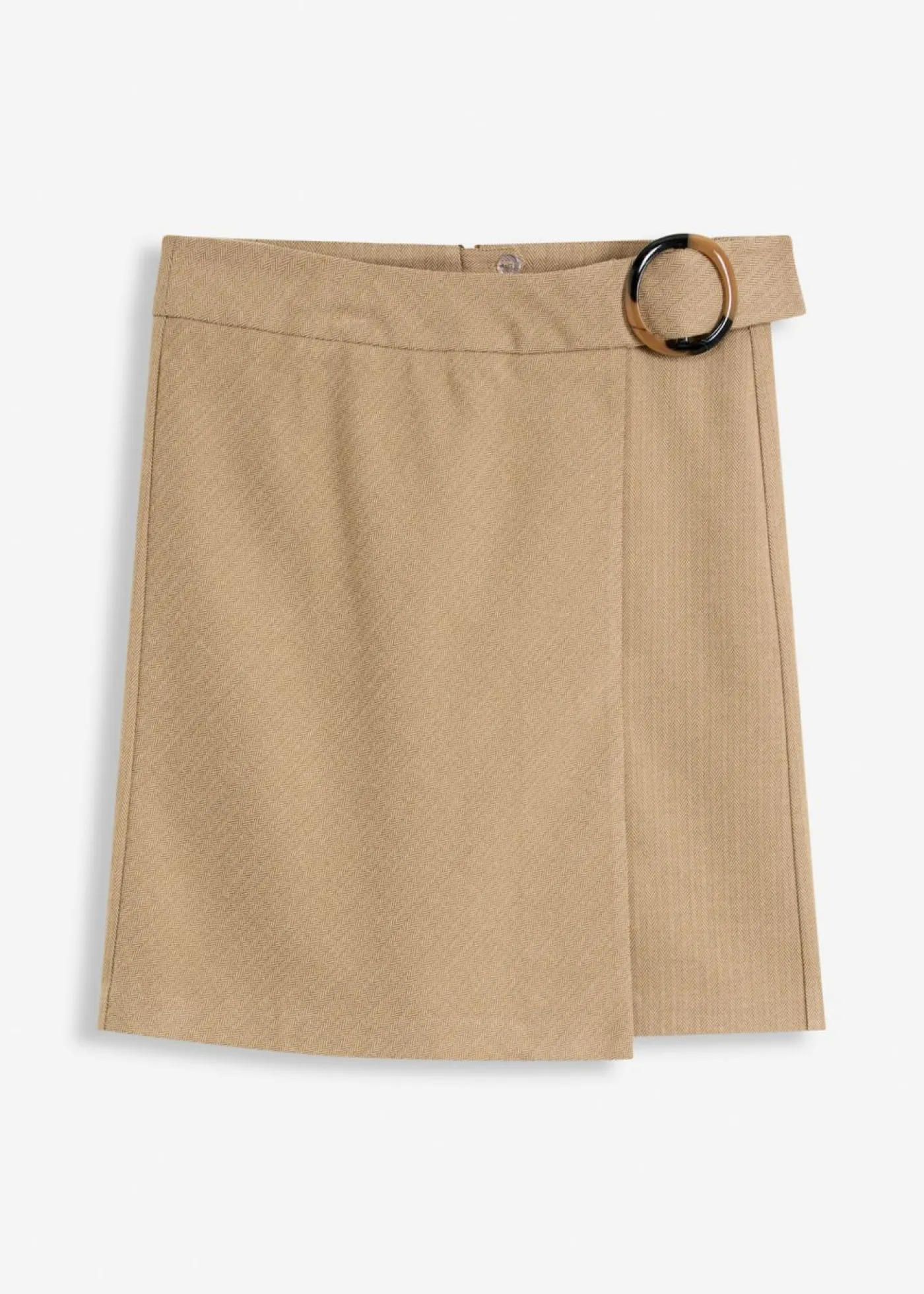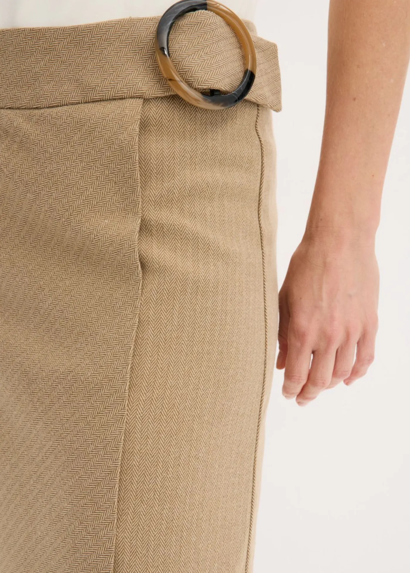 Elegante falda con patrón de espiga y hebilla decorativa.