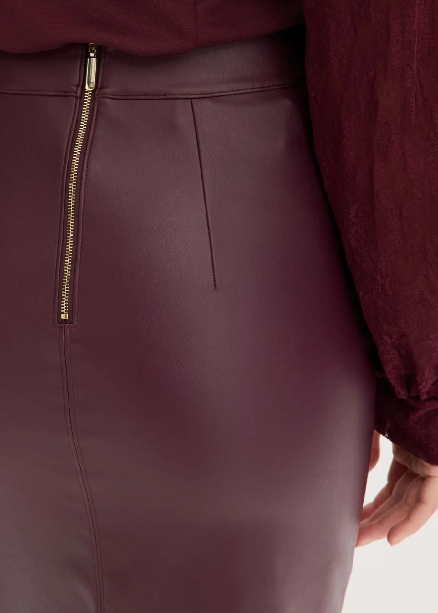 Moderna falda lápiz de piel sintética con un ajuste favorecedor.