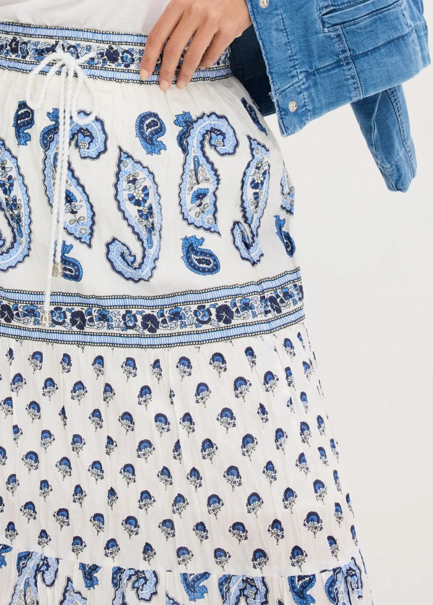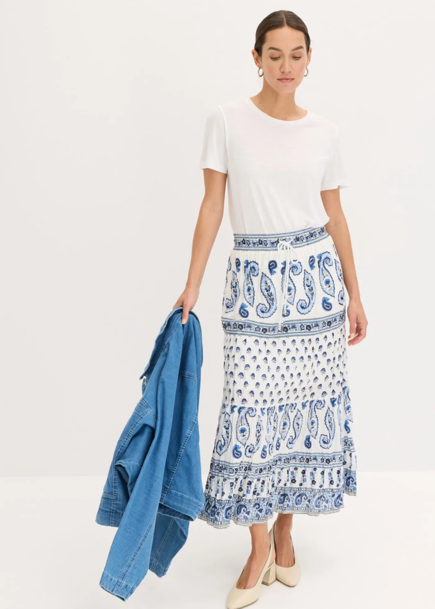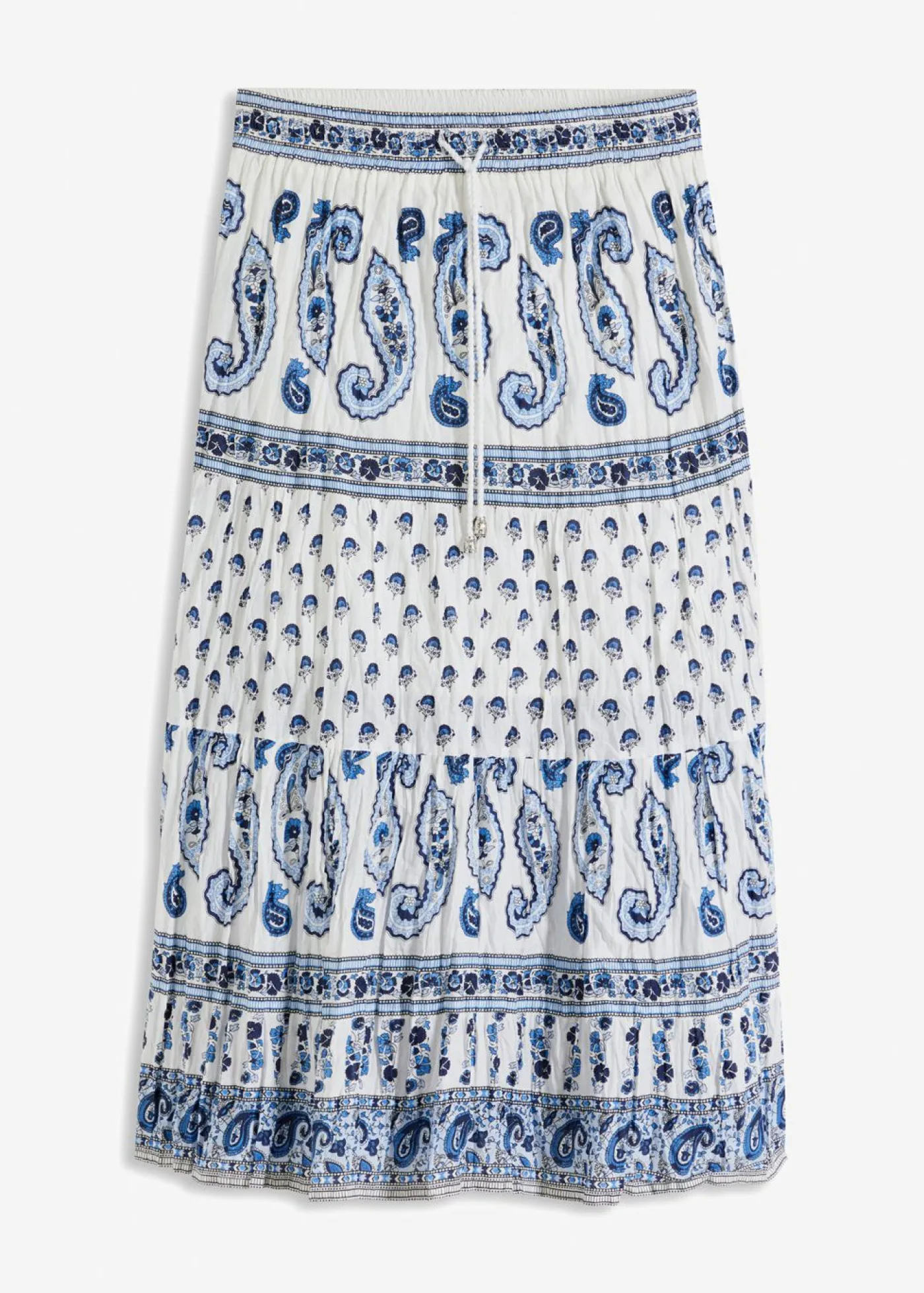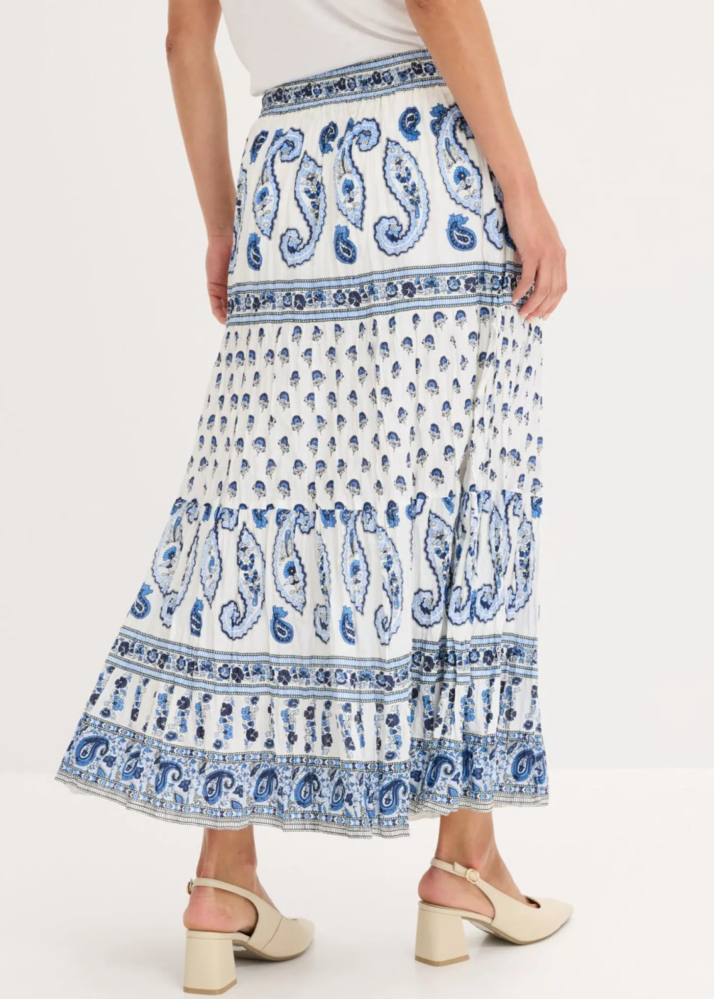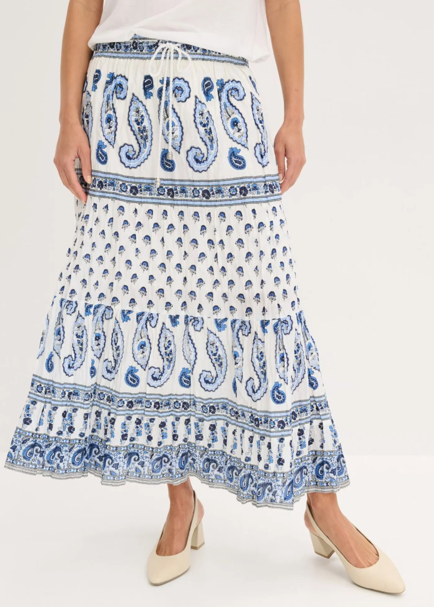 Encantadora falda larga de algodón puro con cinta decorativa. La falda larga de la marca bpc destaca por su corte favorecedor y su bonito estampado. Gracias a su corte sofisticado con cinturilla elástica y tejido cosido a capas, la falda favorece visualmente. El cordón permite ajustar cómodamente el ancho de la cintura. La falda larga de algodón elástico combina perfectamente con un top sencillo. Cada estampado es único. Largo de aprox. 94 cm en talla 42. Se puede lavar a máquina.