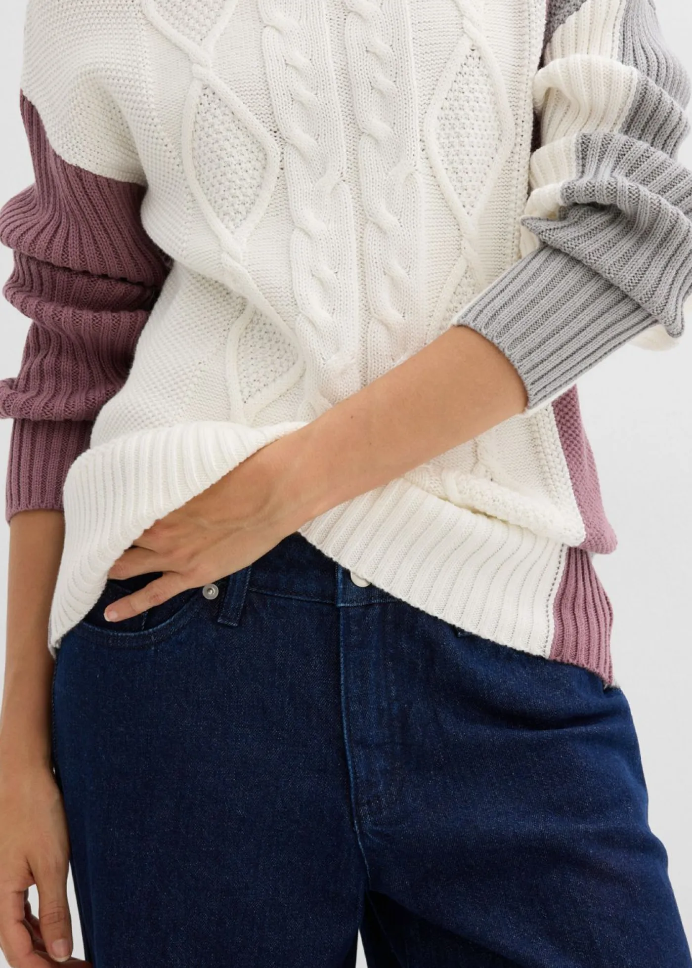 Moderno jersey de punto trenzado con cuello vuelto.
