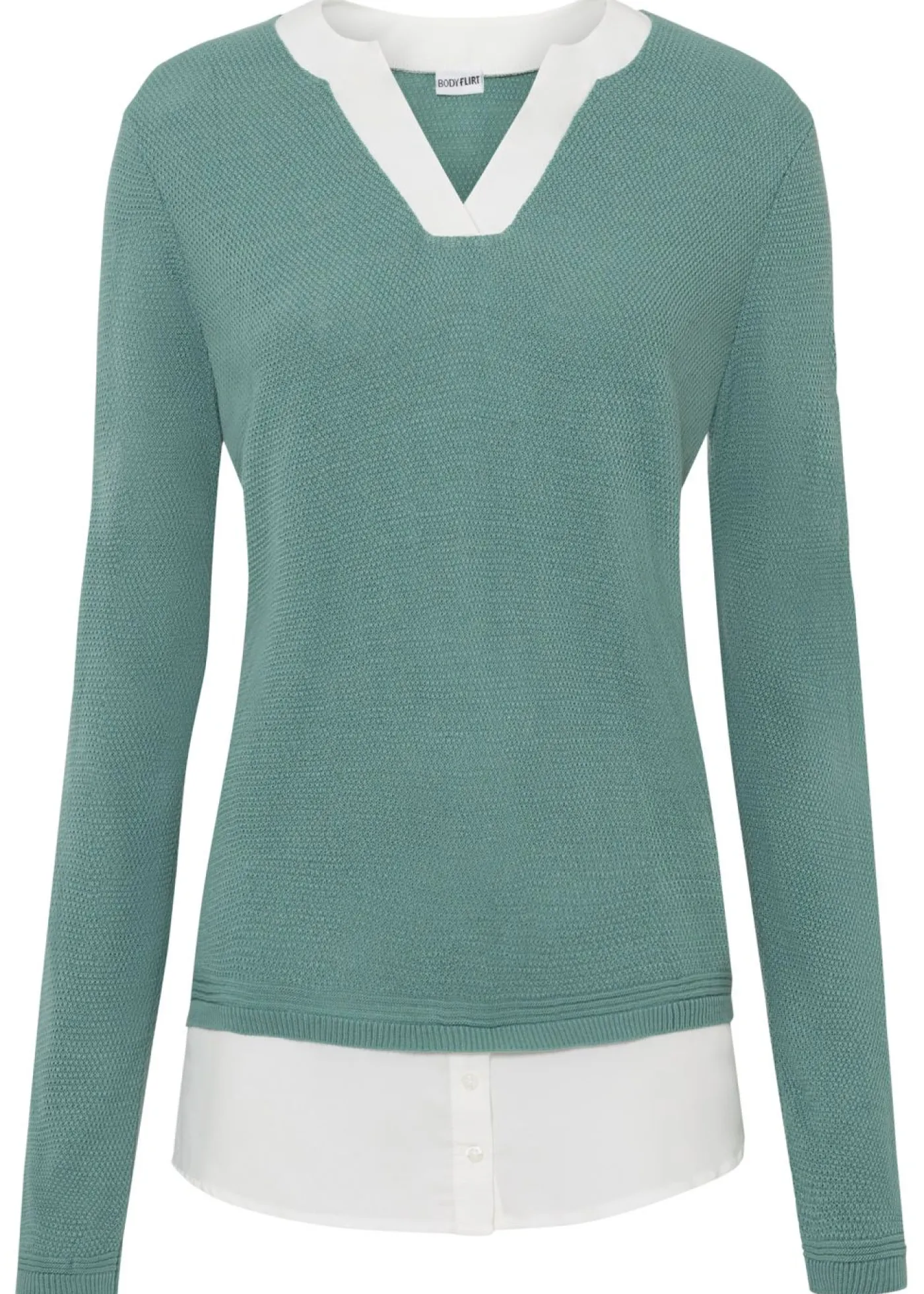 Jersey de manga larga con inserto de blusa e interesante diseño en el escote. Jersey femenino con inserto de blusa y pequeña abertura en la costura lateral. Largo de aprox. 68 cm en talla 36/38.
