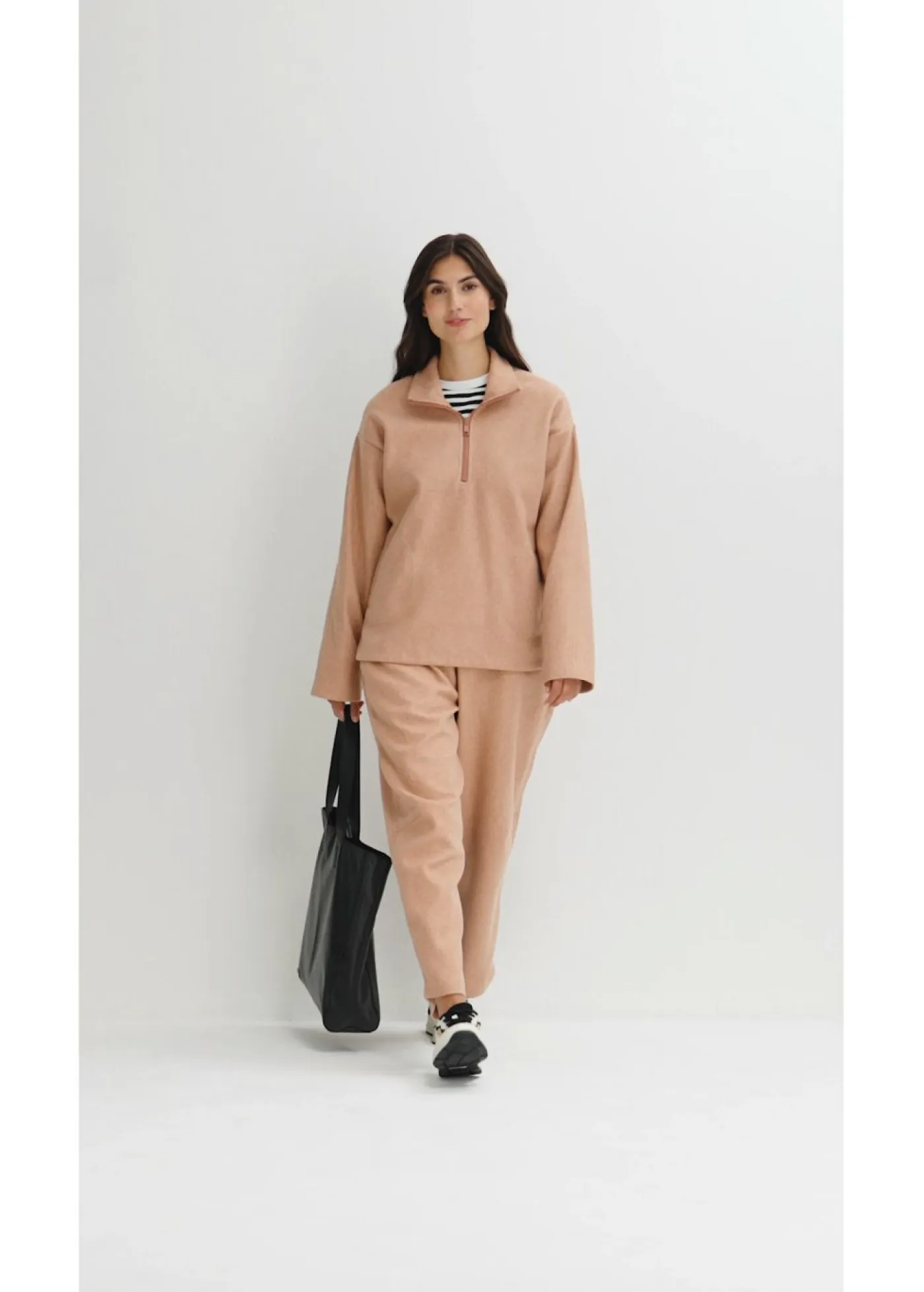 Jersey holgado con cuello alto y cremallera corta. Hombros caídos y bolsillos laterales. Largo de aprox. 74 cm en talla 40/42. Se puede lavar a máquina.