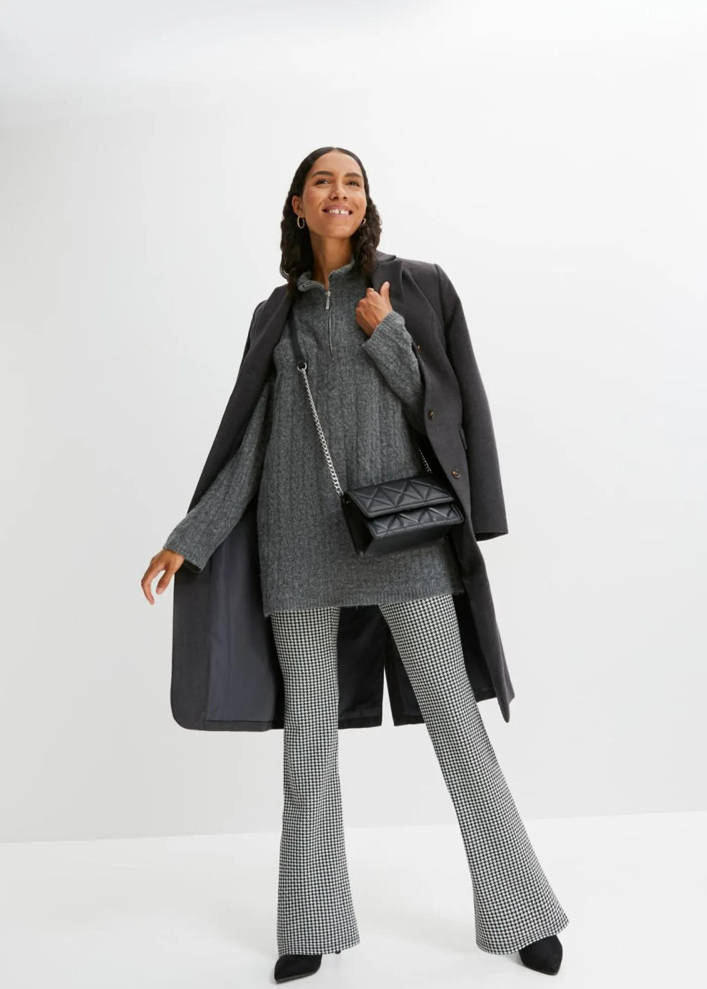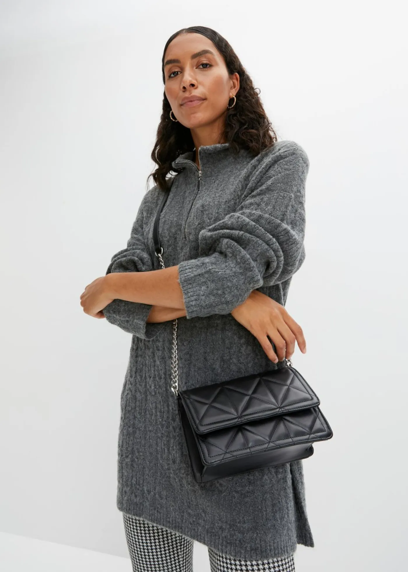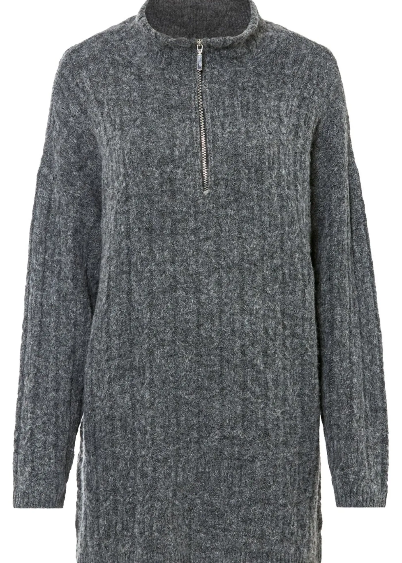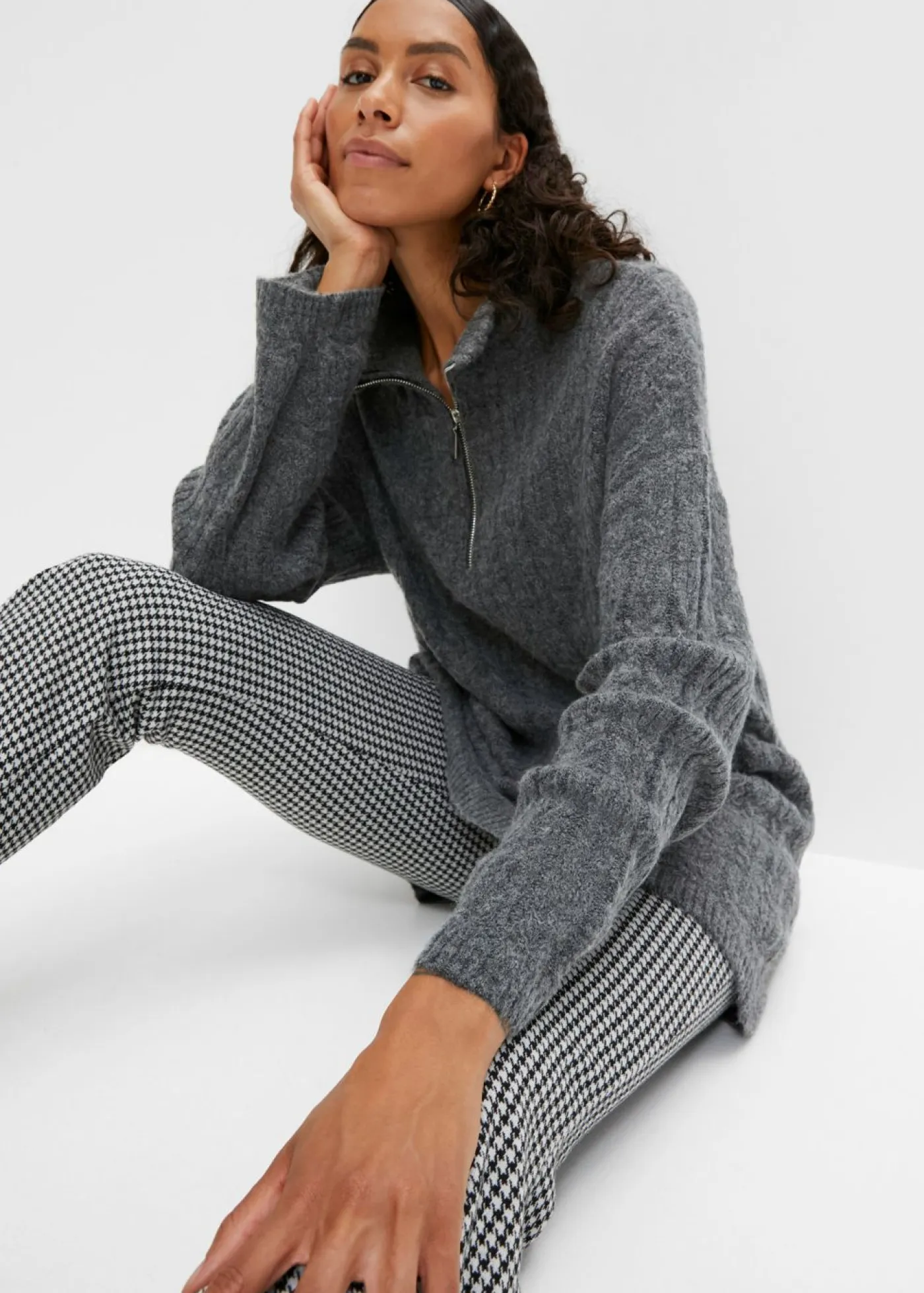 Jersey largo con un moderno patrón trenzado y con cremallera. Largo de aprox. 76 cm en talla 40/42. Se puede lavar a máquina.
