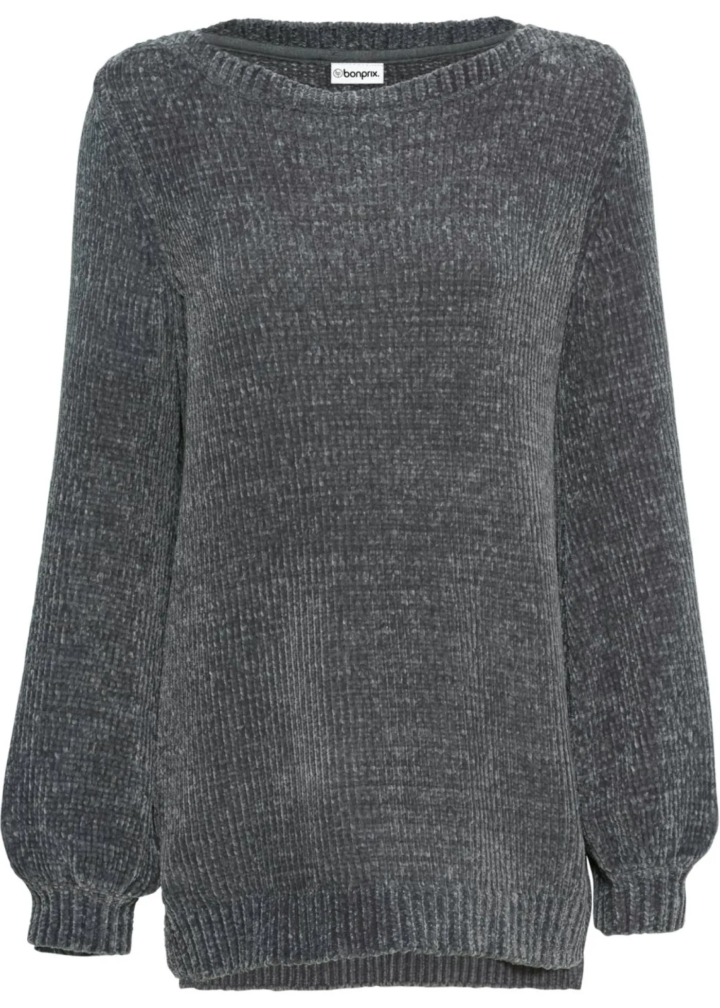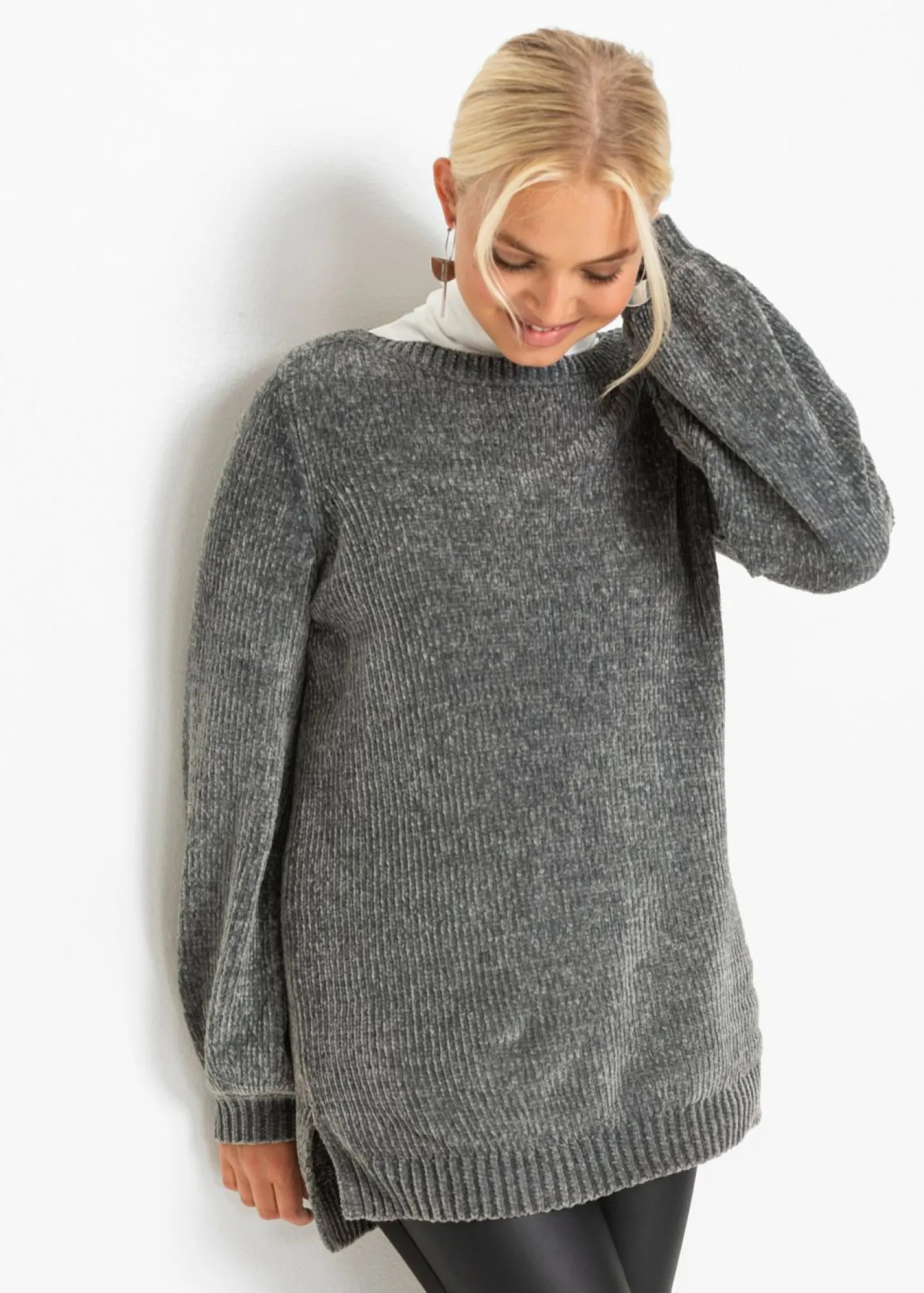 Jersey de chenilla suave con aberturas laterales. Con escote en V y mangas largas. El material cómodo y cálido garantiza un alto nivel de confort.
