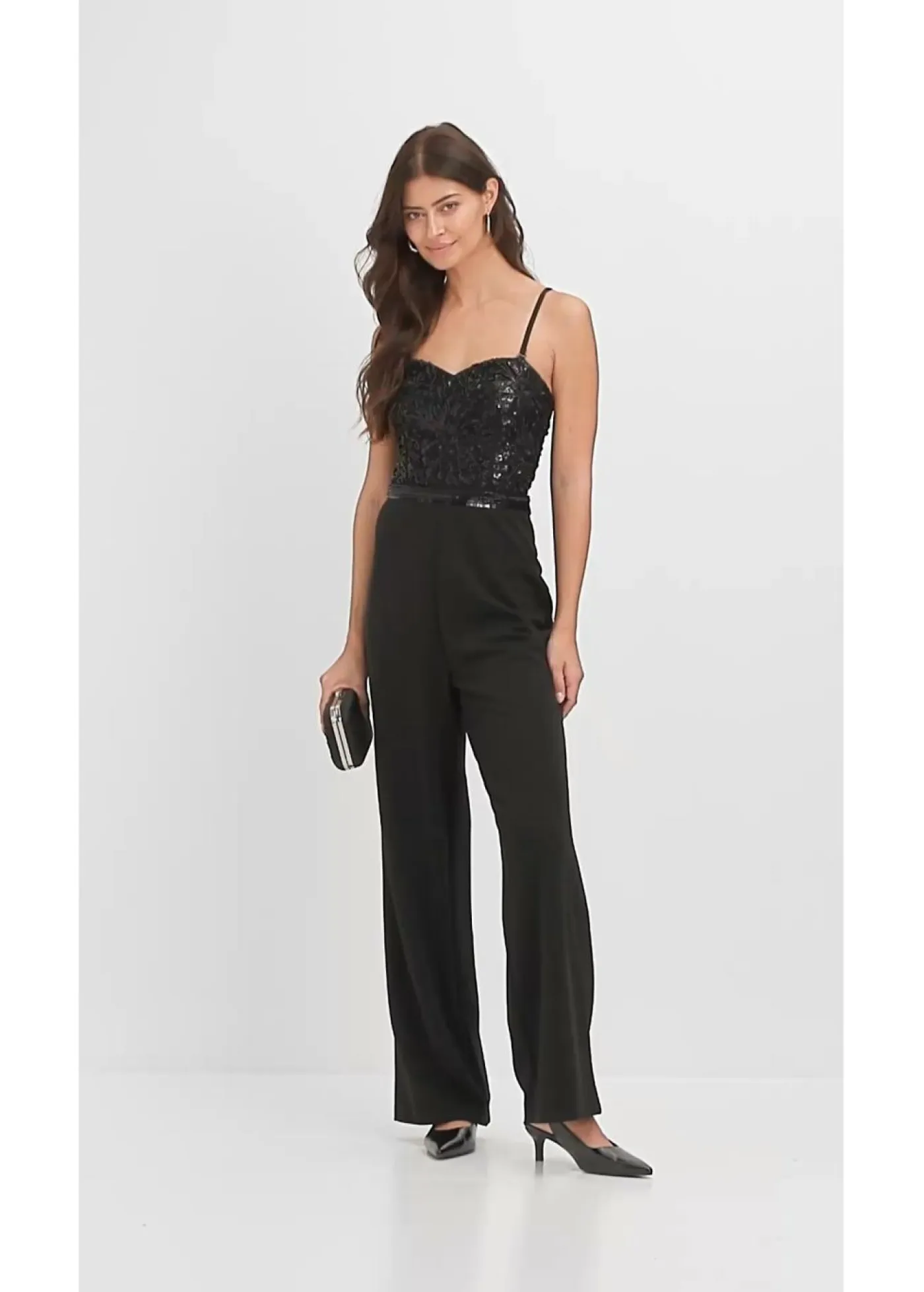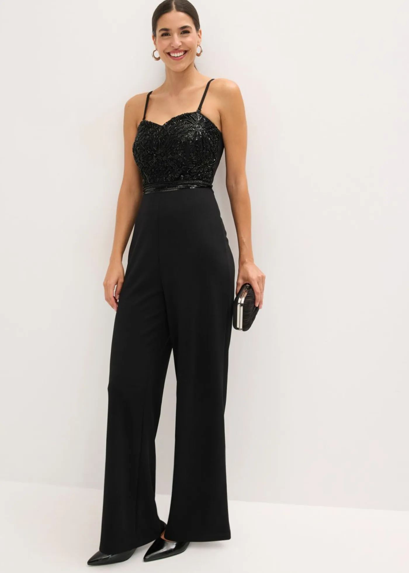 Moderno y sensual: Mono de crepé estructurado con escote tipo bustier y bordado de perlas en la parte superior.