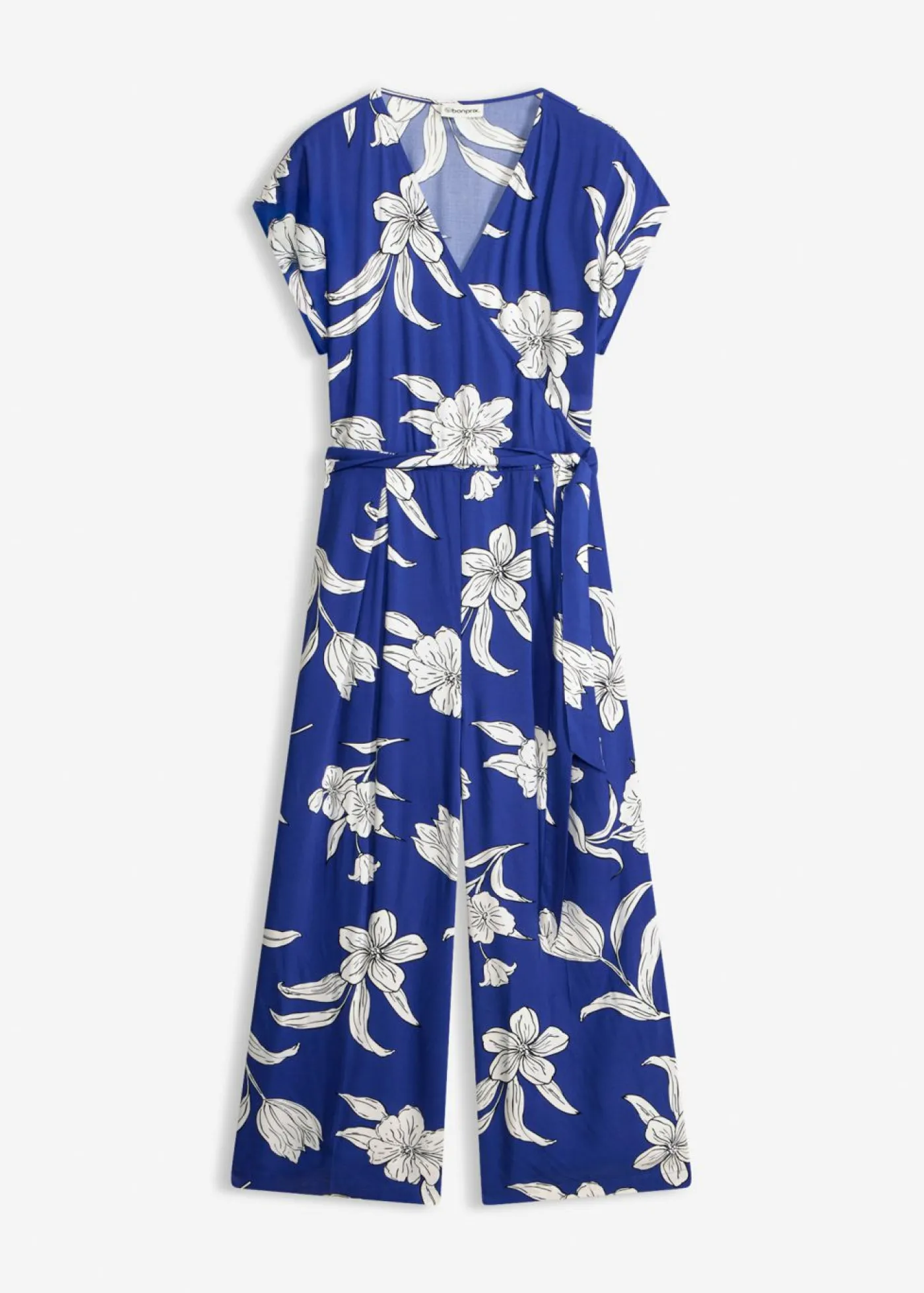 Mono con estampado de flores, escote en V superpuesto en la parte delantera y cintura elástica en la parte trasera.