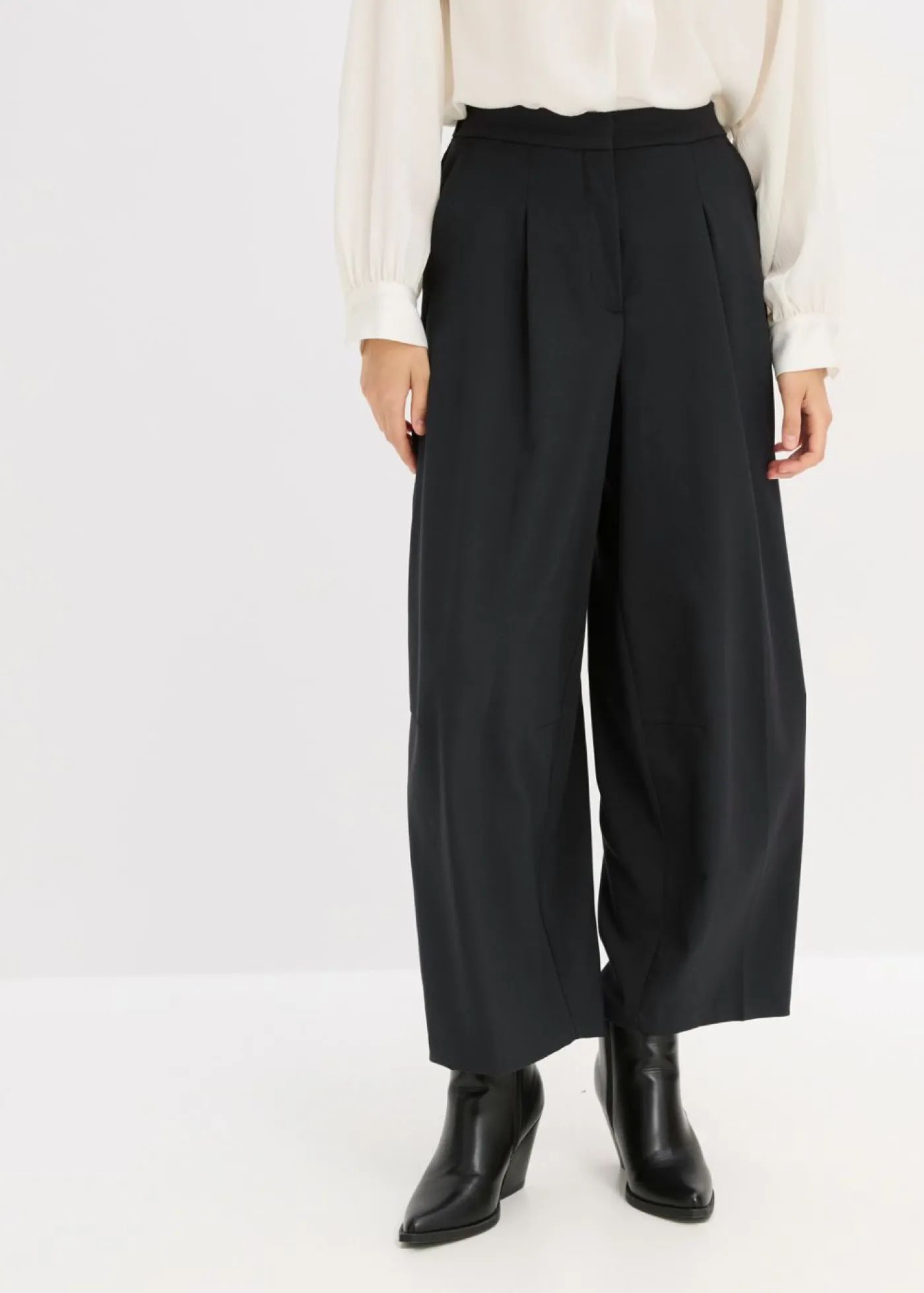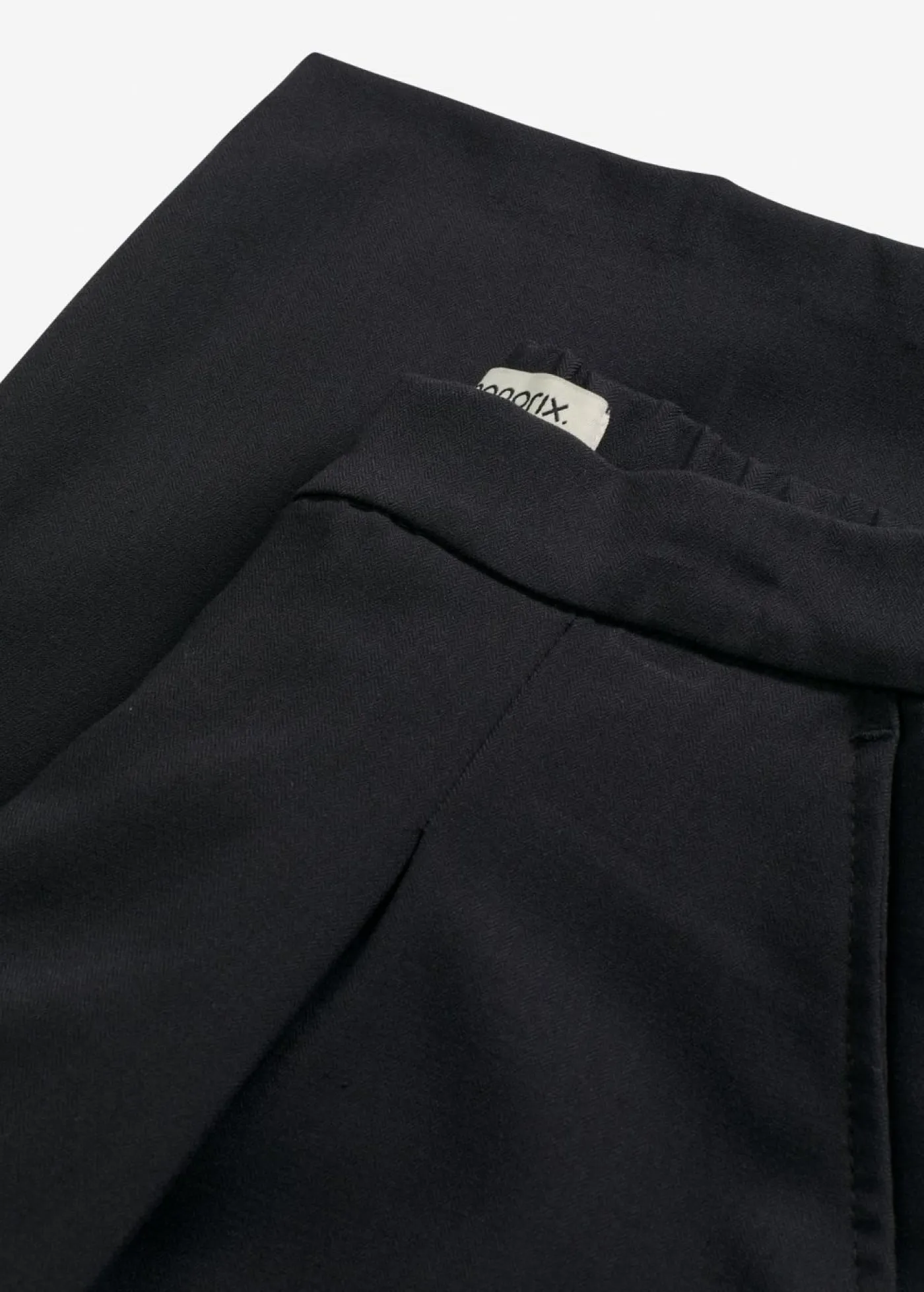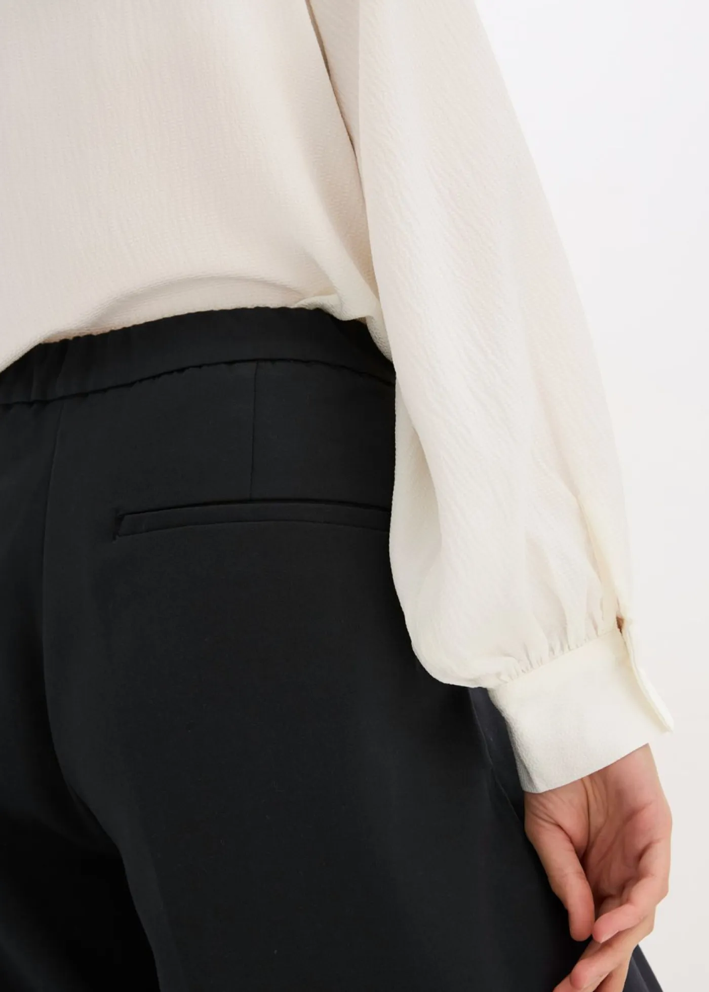 Pantalón con pinzas, corte ligeramente barrel, bolsillos laterales y cintura parcialmente elástica con cremallera y cierre de gancho oculto en la parte delantera.