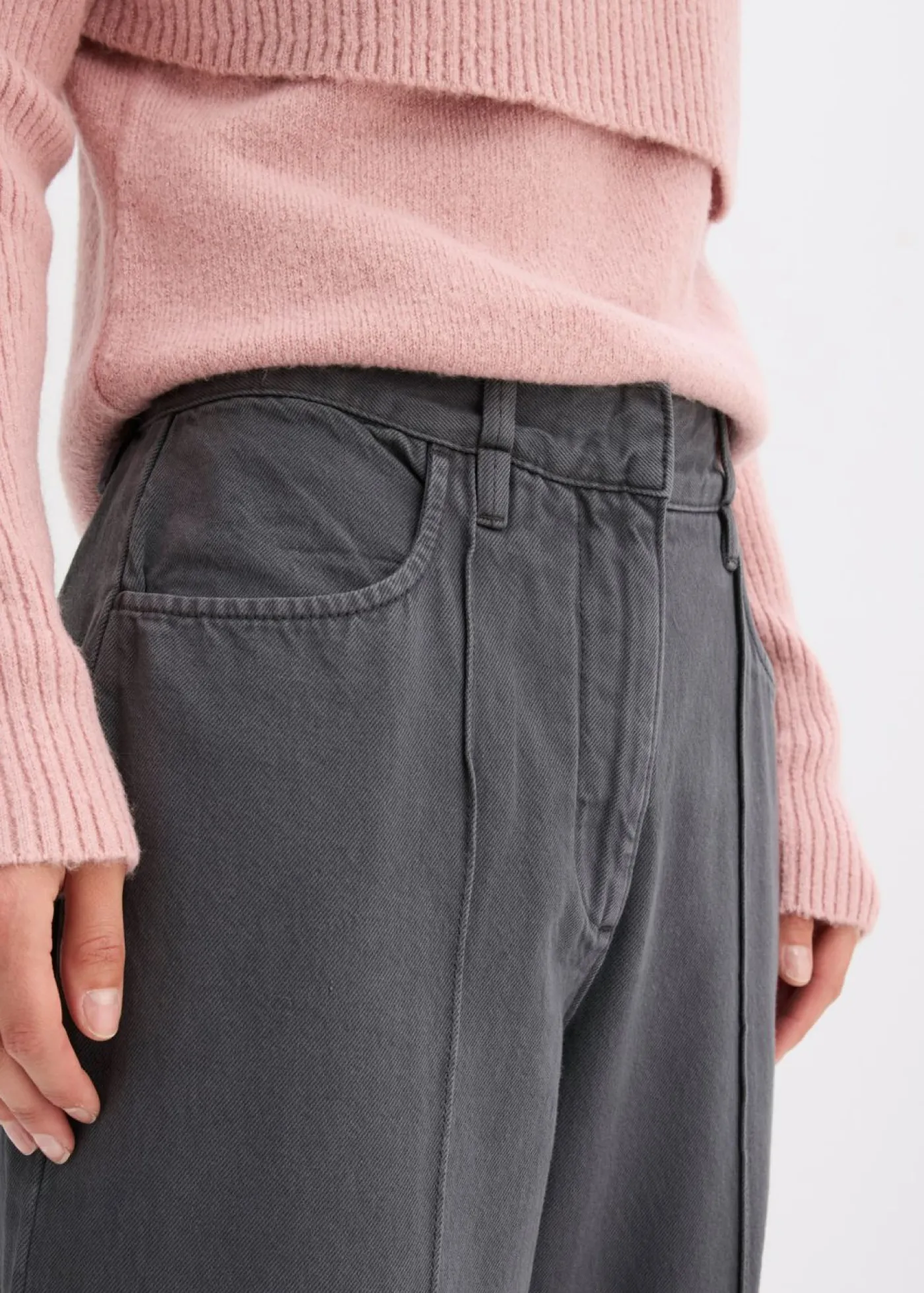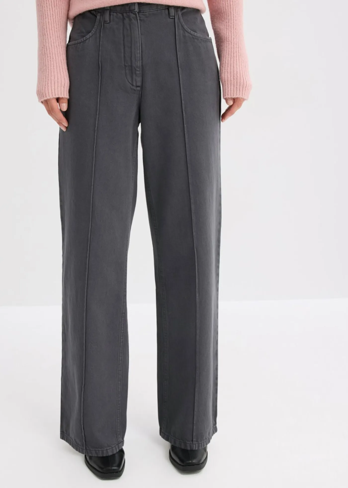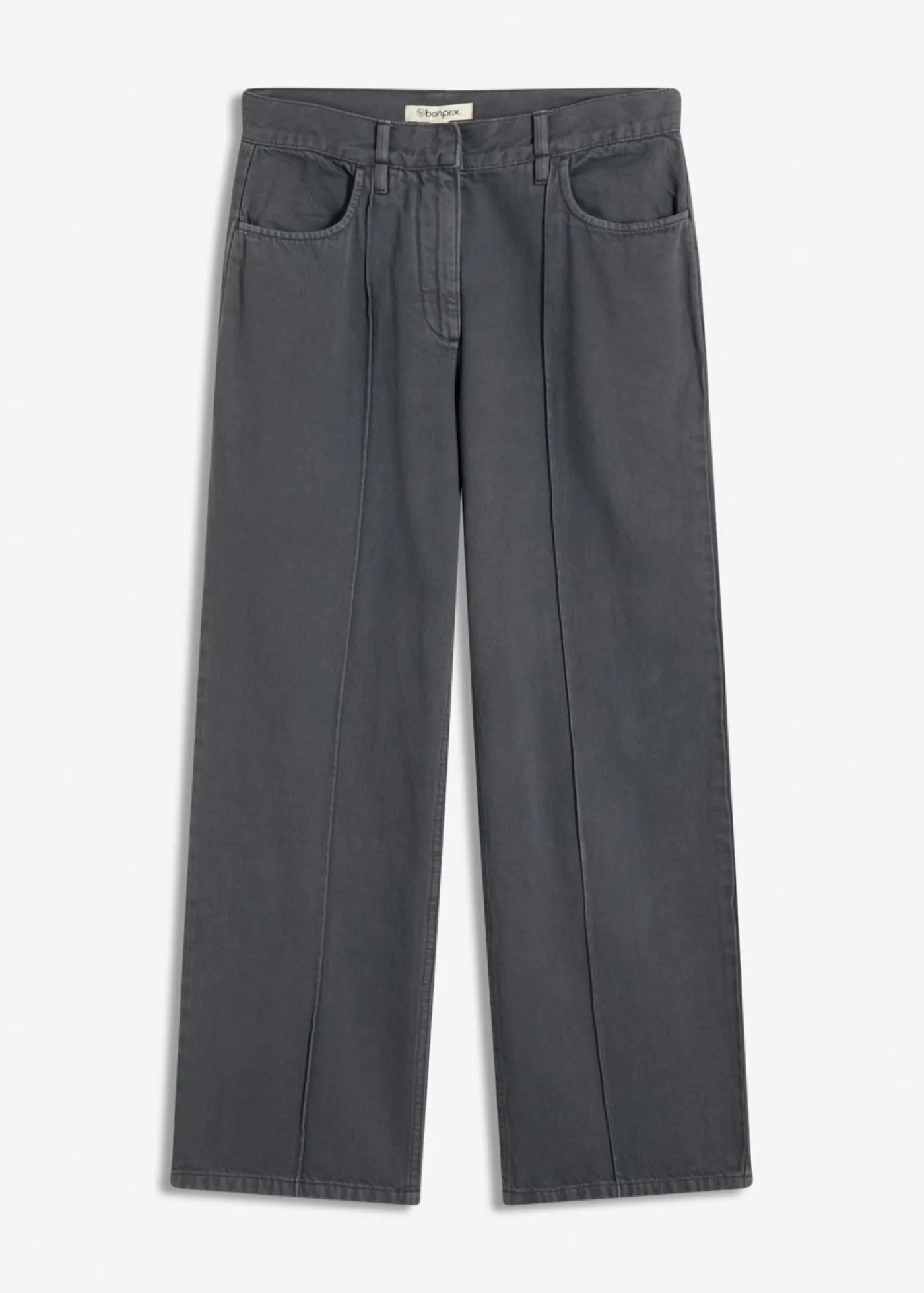 Pantalón informal de sarga con perneras anchas y bolsillos laterales.