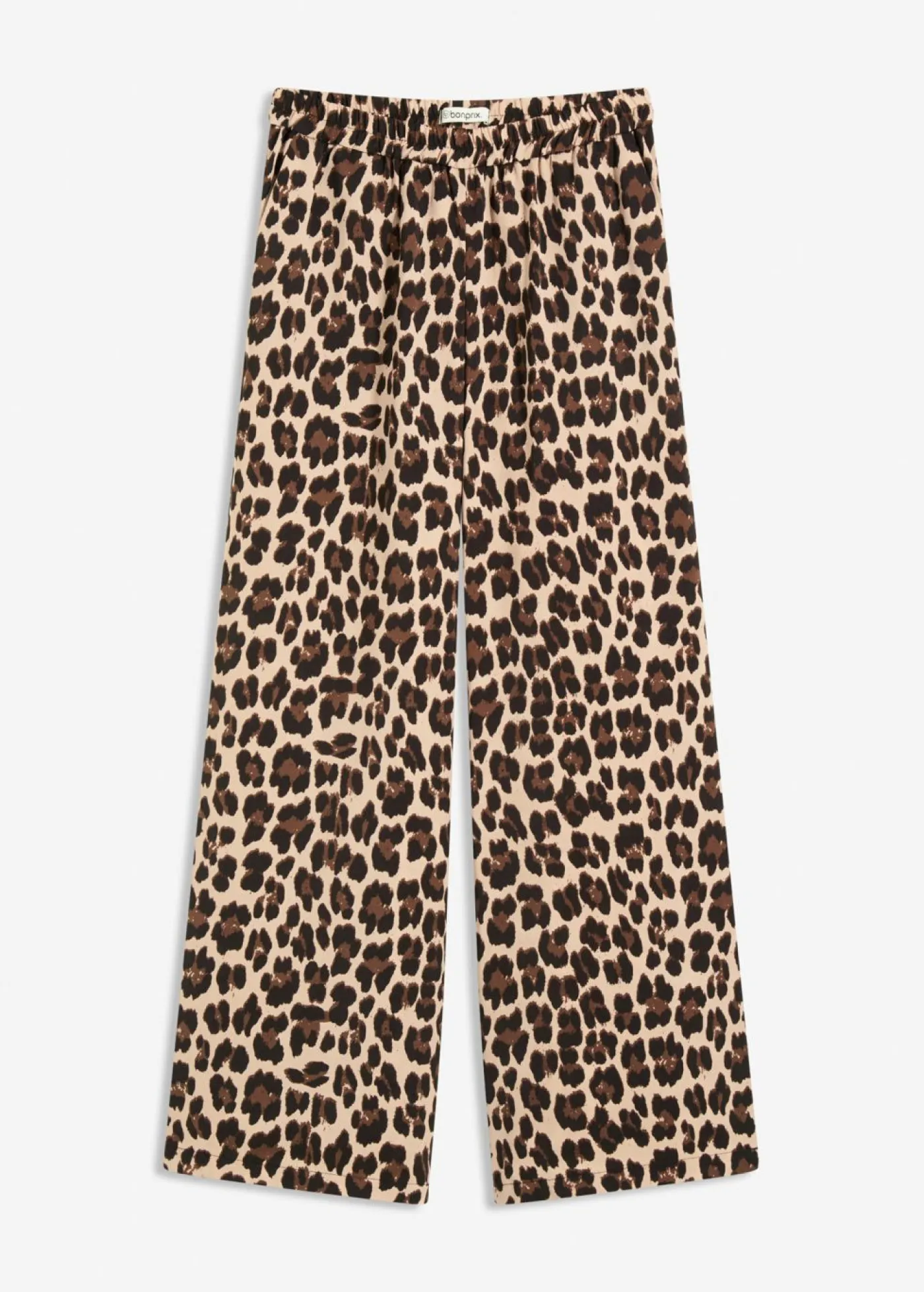 Pantalón palazzo de satén fluido con estampado moderno y cinturilla elástica.