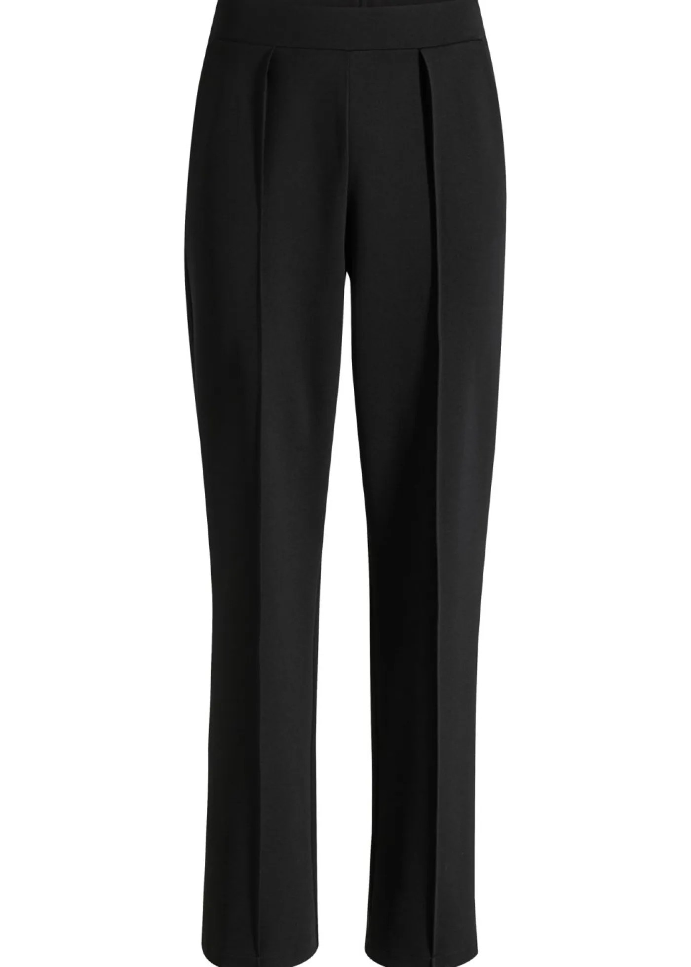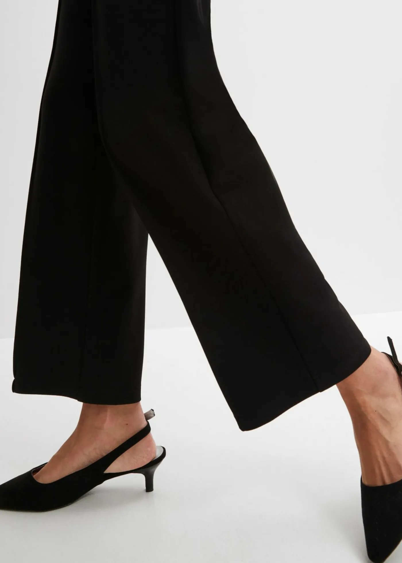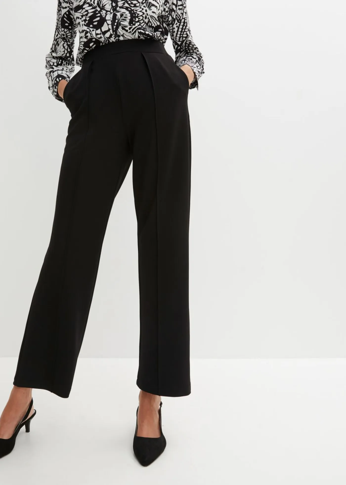Cómodo pantalón sin cierre de tejido interlock resistente con aspecto plegado y bolsillos.