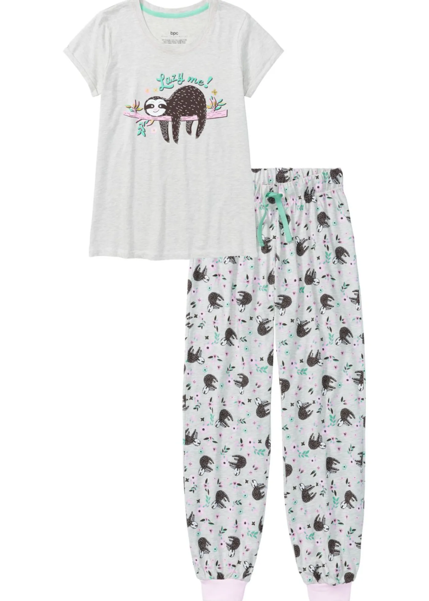 Pijama suave con motivo de perezoso. La camisa de este conjunto de dos piezas presenta mangas cortas vueltas y un cómodo escote redondo. El pantalón puede ajustarse en anchura mediante un cordón ajustable en la cintura. Los elásticos en las perneras se encargan de darle un look moderno.