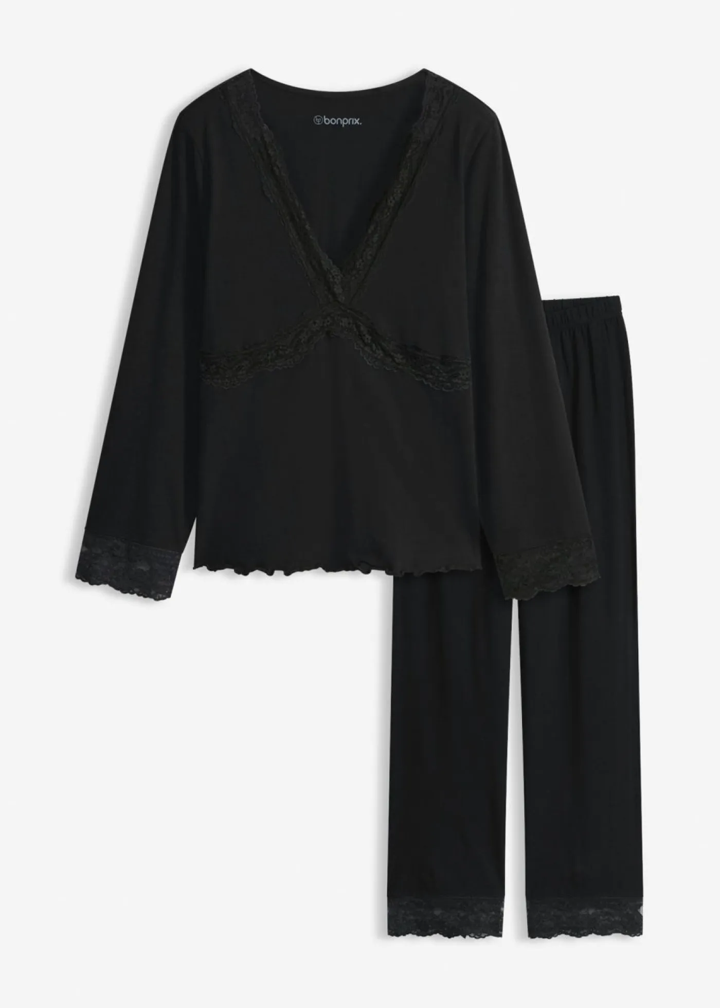 Pijama femenino con escote en V y encaje en el escote, las mangas y el dobladillo del pantalón.