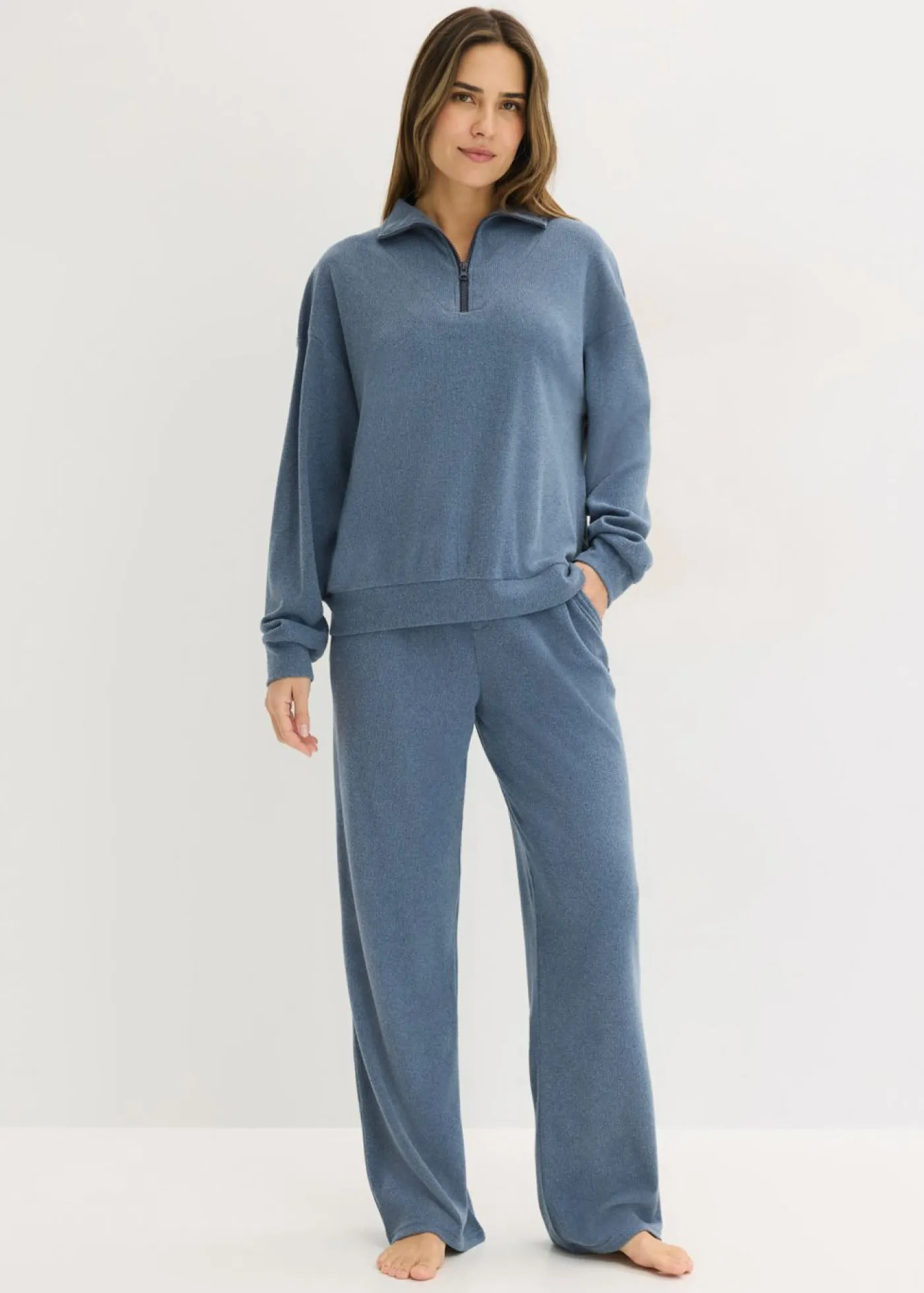 Cómodo pijama de suave tejido de rizo con pantalón con bolsillos y camiseta con cuello alto y puños en las mangas y el dobladillo.