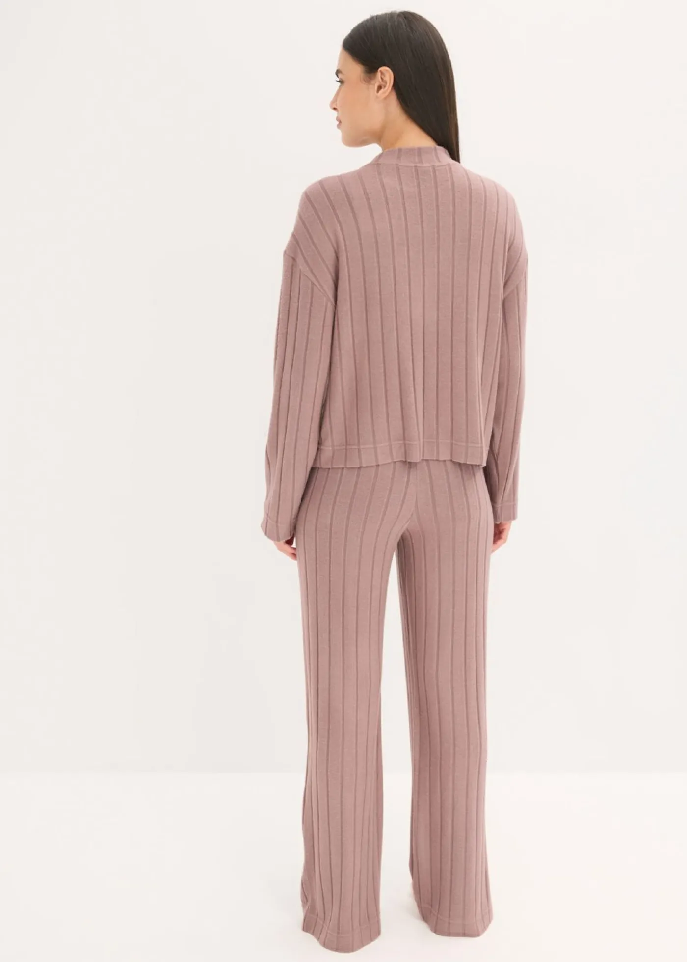 Moderno pijama holgado con cuello alto, mangas anchas, pantalón ancho y bolsillos laterales.