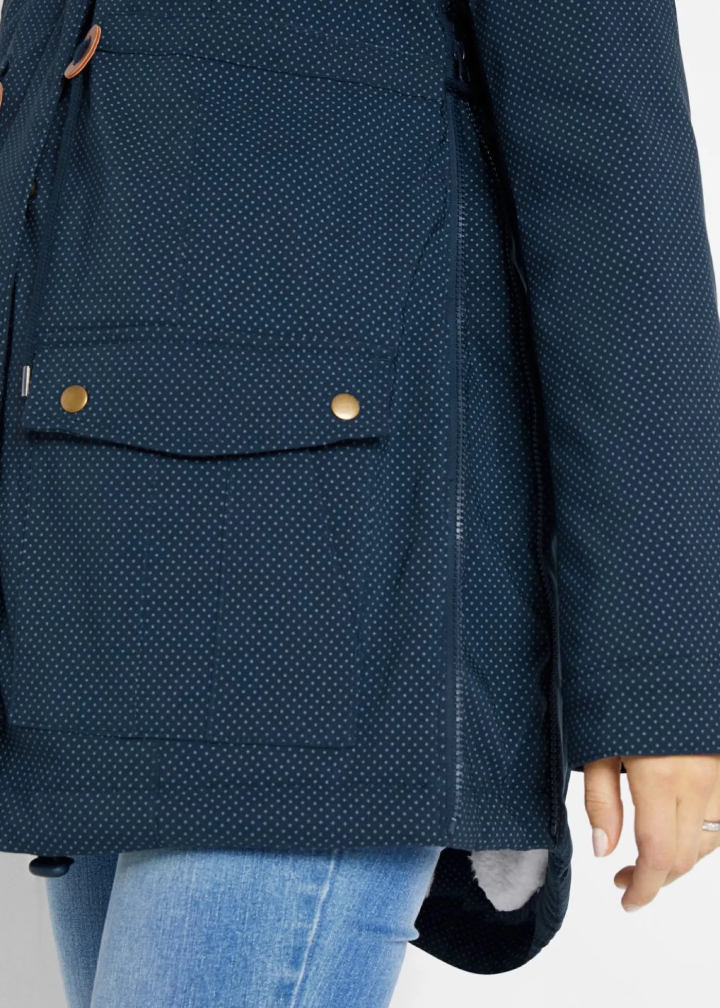 Suave chaqueta premamá con forro de pelo para durante y después del embarazo. Las cremalleras laterales ofrecen anchura adicional y permiten llevar la chaqueta incluso después del embarazo. Un inserto de porteo desmontable con capucha protege al bebé del viento y las inclemencias del tiempo. Con cremallera bidireccional y cuello alto con botones a presión. Con capucha y cordón bajo el pecho con topes. Grandes bolsillos y puños ajustables.