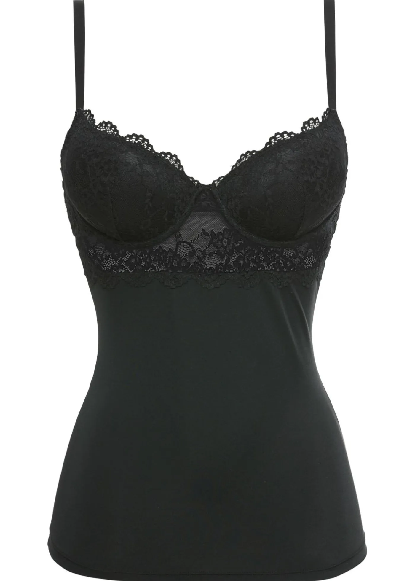 Práctico top con sujetador integrado y poliamida reciclada. Esta elegante camiseta interior con sujetador combina sujetador y camiseta interior en una sola prenda. Este femenino modelo de BODYFLIRT presenta elegante encaje en la parte superior de la camiseta. Los aros garantizan una gran sujeción.La elegante camiseta interior con sujetador se abrocha en la espalda con corchetes.