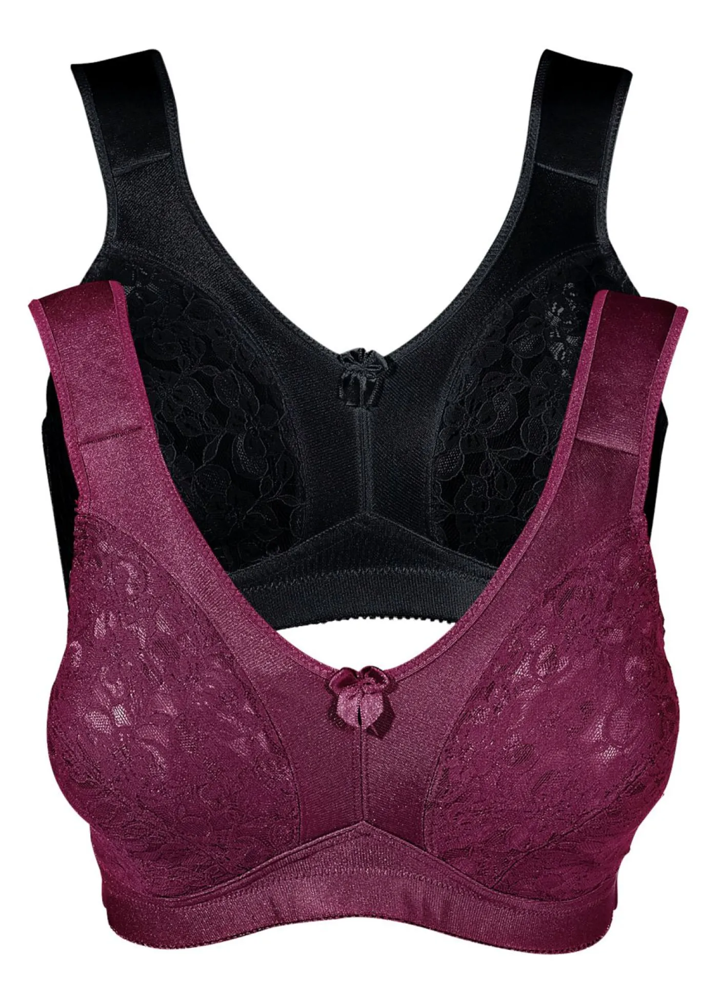 Sujetador sin aros con encaje sofisticado. Sujetador sin aros en un atractivo paquete doble. Los tirantes acolchados alivian los hombros y confieren a una sujeción segura. Las copas están decoradas con encaje de gran calidad.