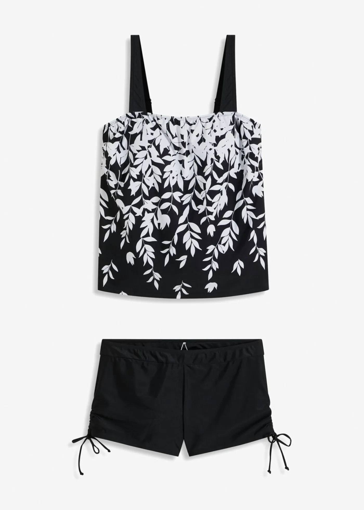 Moderno tankini con estampado degradado. Con copas integradas, forro en el pecho y banda elástica bajo el pecho. Tirantes ajustables. Braguita de bikini con lazos laterales ajustables.