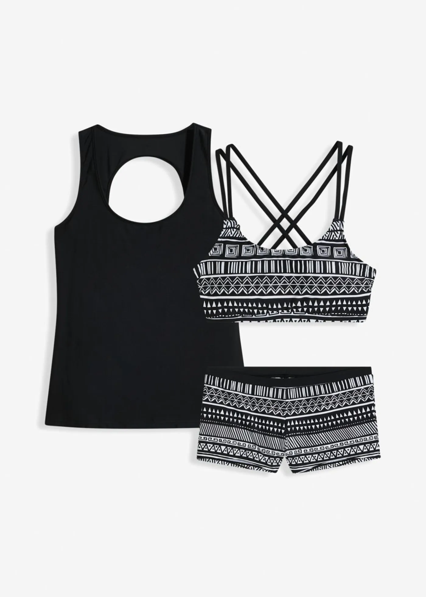 Tankini de tres piezas en un atractivo look de contrastes. Tankini de 3 piezas con bustier, camiseta sin mangas y braguitas, se puede llevar solo o por capas. Bustier con estampado integral y tirantes ajustables que se cruzan en la espalda. Copas blandas extraíbles y bajo elástico. Camiseta de tirantes con espalda deportiva.