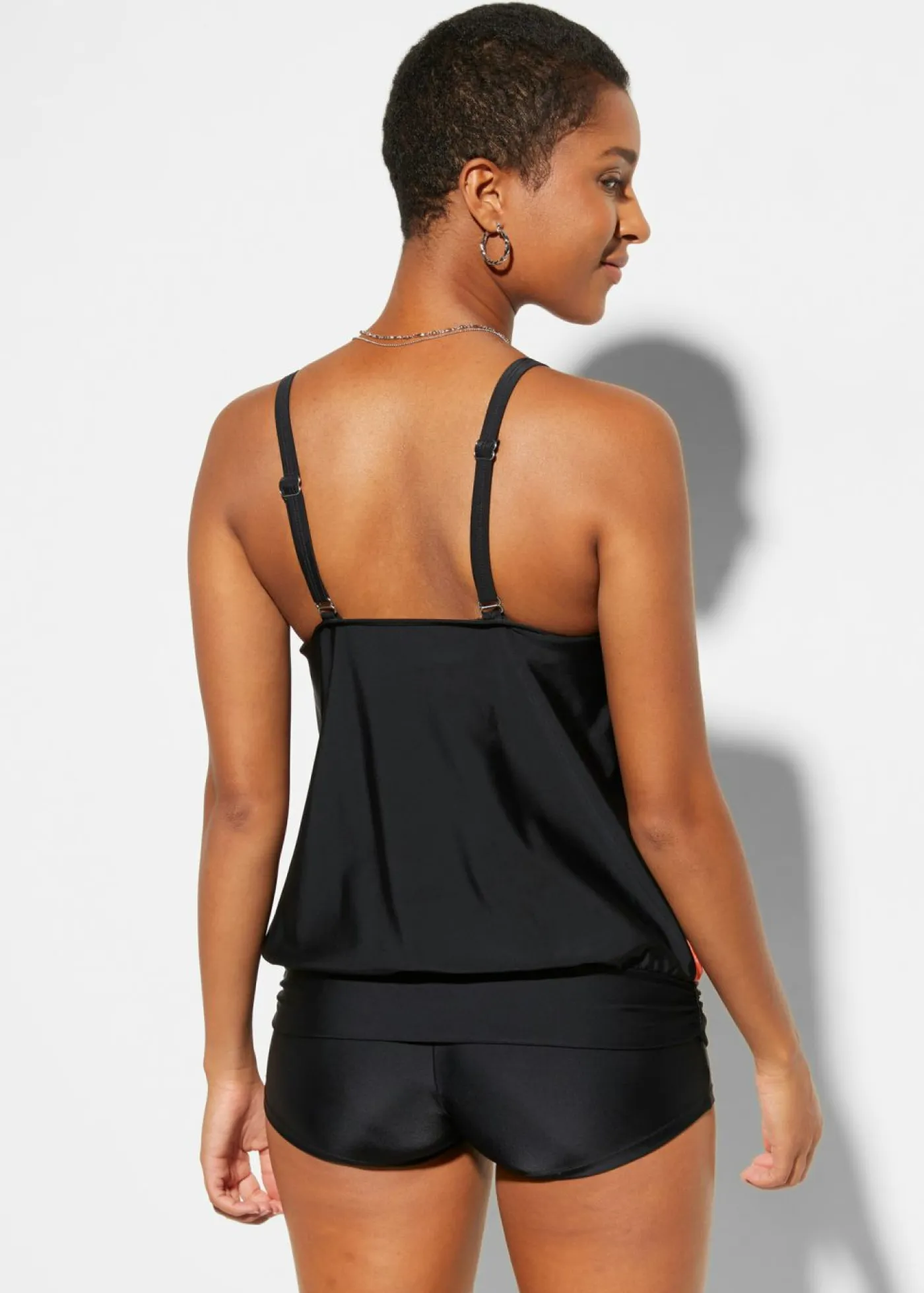 Precioso tankini estampado con braguita tipo pantalón. Parte superior con fruncido lateral. Con tirantes ajustables. Copas suaves extraíbles, forro en la parte del pecho y goma elástica debajo del pecho para una sujeción cómoda. Braguita de bikini tipo pantalón.