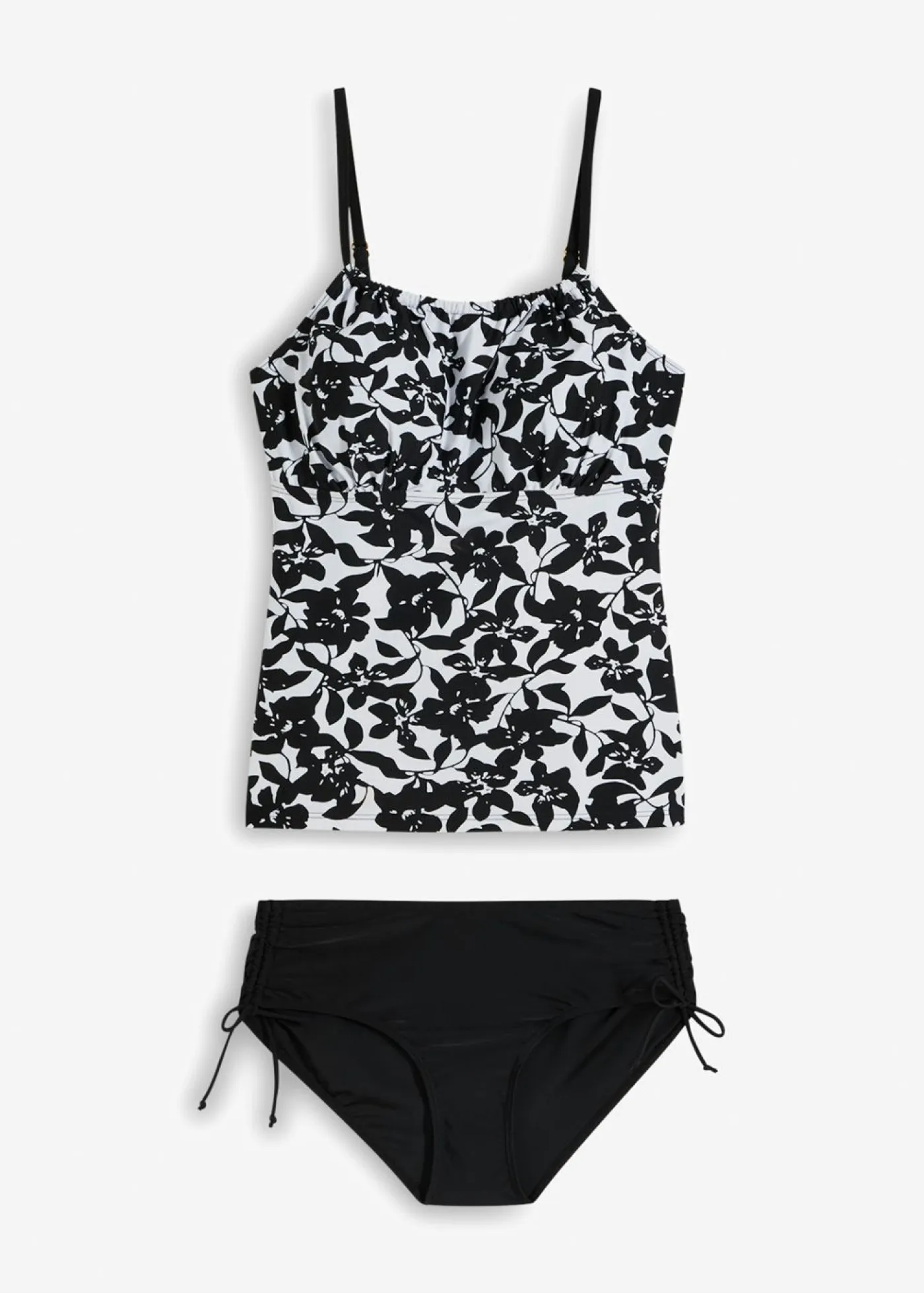 Tankini favorecedor con tirantes ajustables. Con tirantes ajustables. Cuello redondo con pequeño fruncido. Con forro en el pecho, copas suaves integradas y goma elástica bajo el pecho. Bragas más anchas en los laterales y ajustables en longitud con cordones.