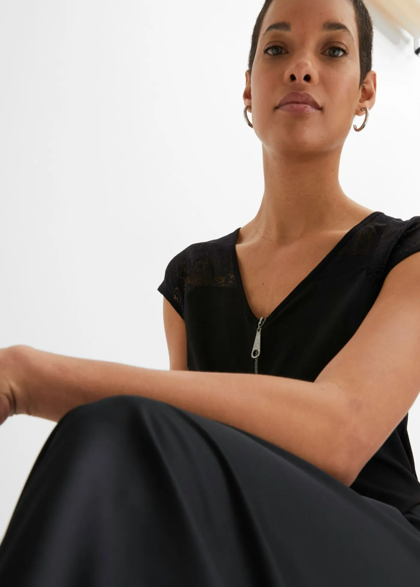 Camiseta original con cremallera y bonitas inserciones de encaje. Con sus hombros transparentes de encaje y su sexy escote en V con cremallera, este top de manga tres cuartos se puede llevar de forma elegante o informal según la ocasión. Lavable a máquina. Largo aproximado 66 cm.