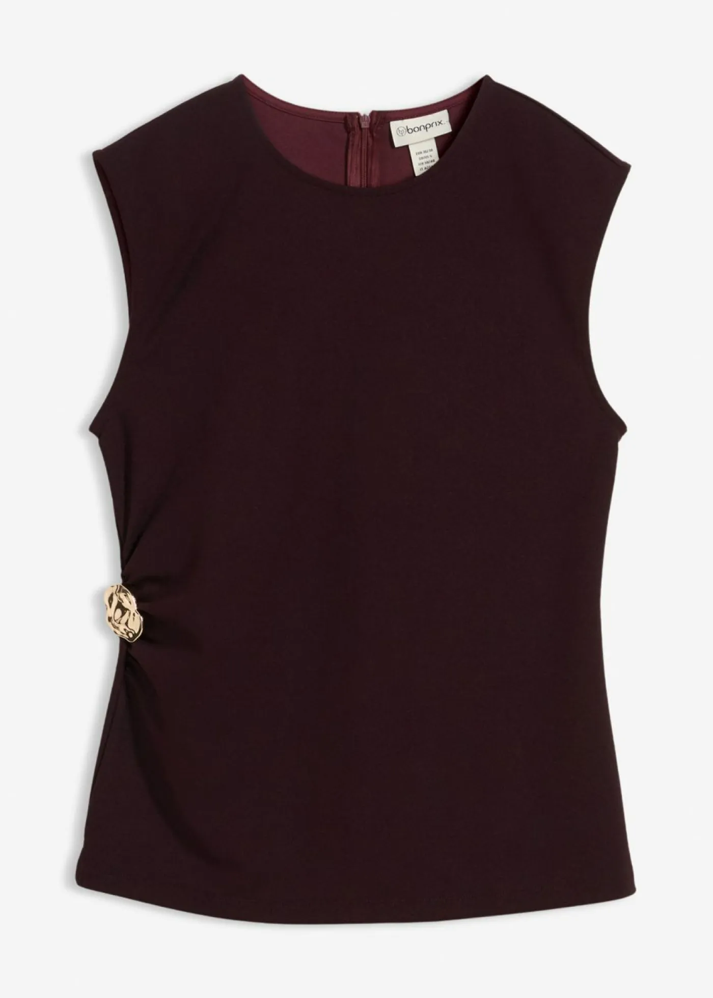 Top sin mangas con cintura fruncida y hebilla decorativa en la cintura. Cremallera oculta en la parte posterior.