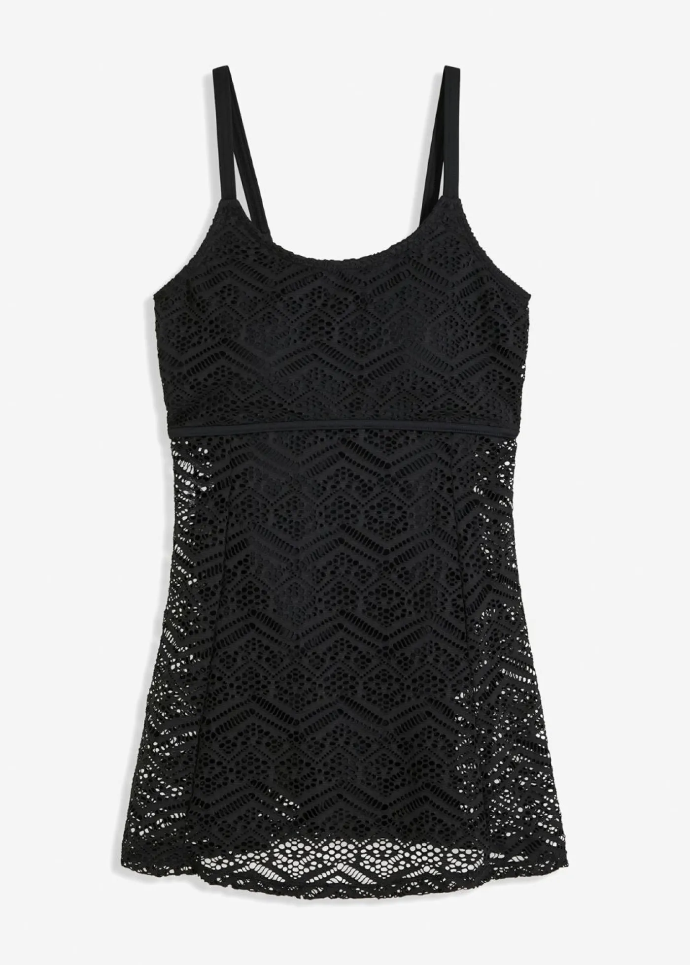 Traje de baño moderno con encaje elástico. Con bañador integrado. Con tirantes ajustables. Con forro y copas suaves. Goma elástica en la zona bajo el pecho.