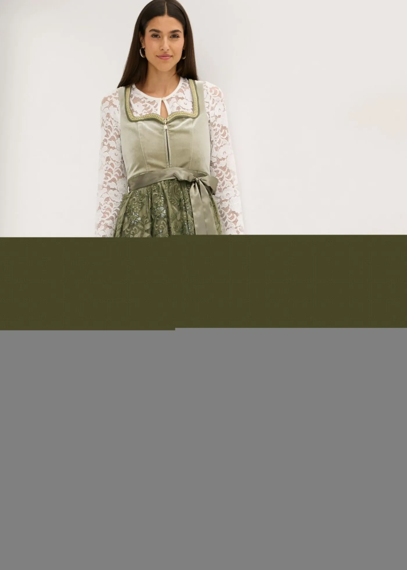 Traje tirolés brillante con delantal de lentejuelas y cordón. Largo de aprox. 114 cm (en todas las tallas). Se puede lavar a máquina.