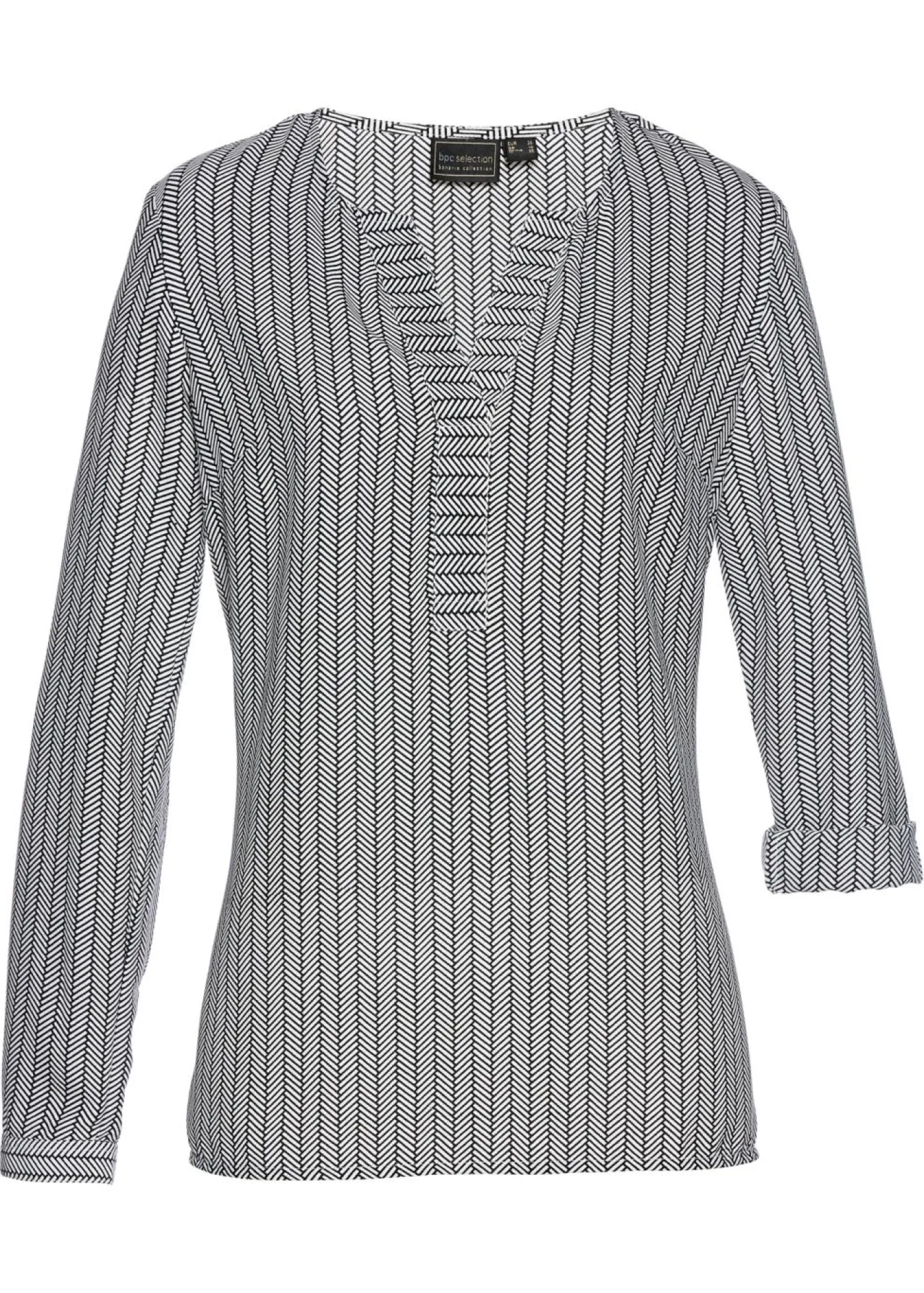 Blusa atemporal con escote en V. Más largo por detrás que por delante. Manga larga ajustable. Largo de aprox. 68 cm (talla 36) a aprox. 77 cm (talla 54). Se puede lavar a máquina.