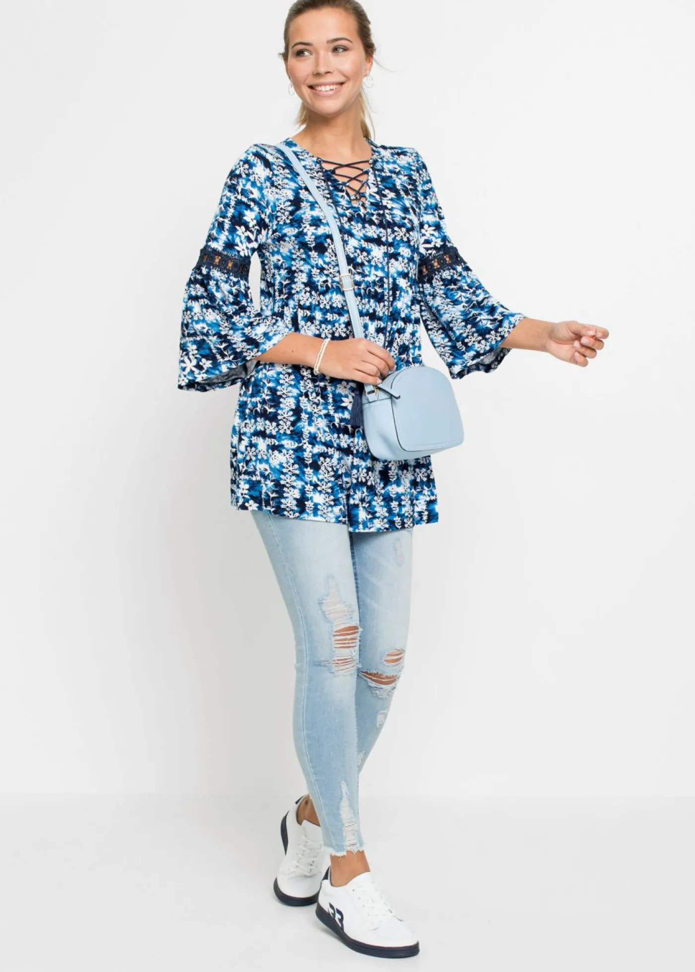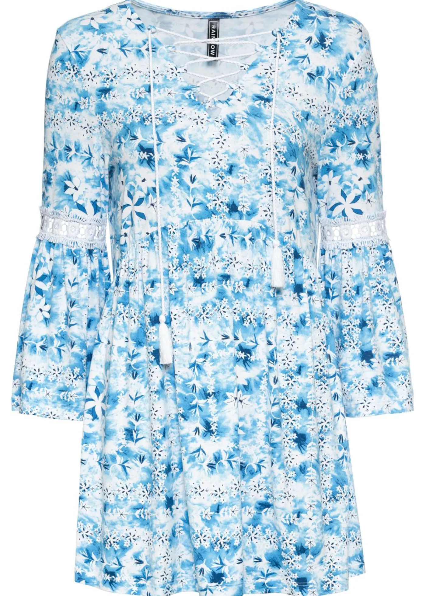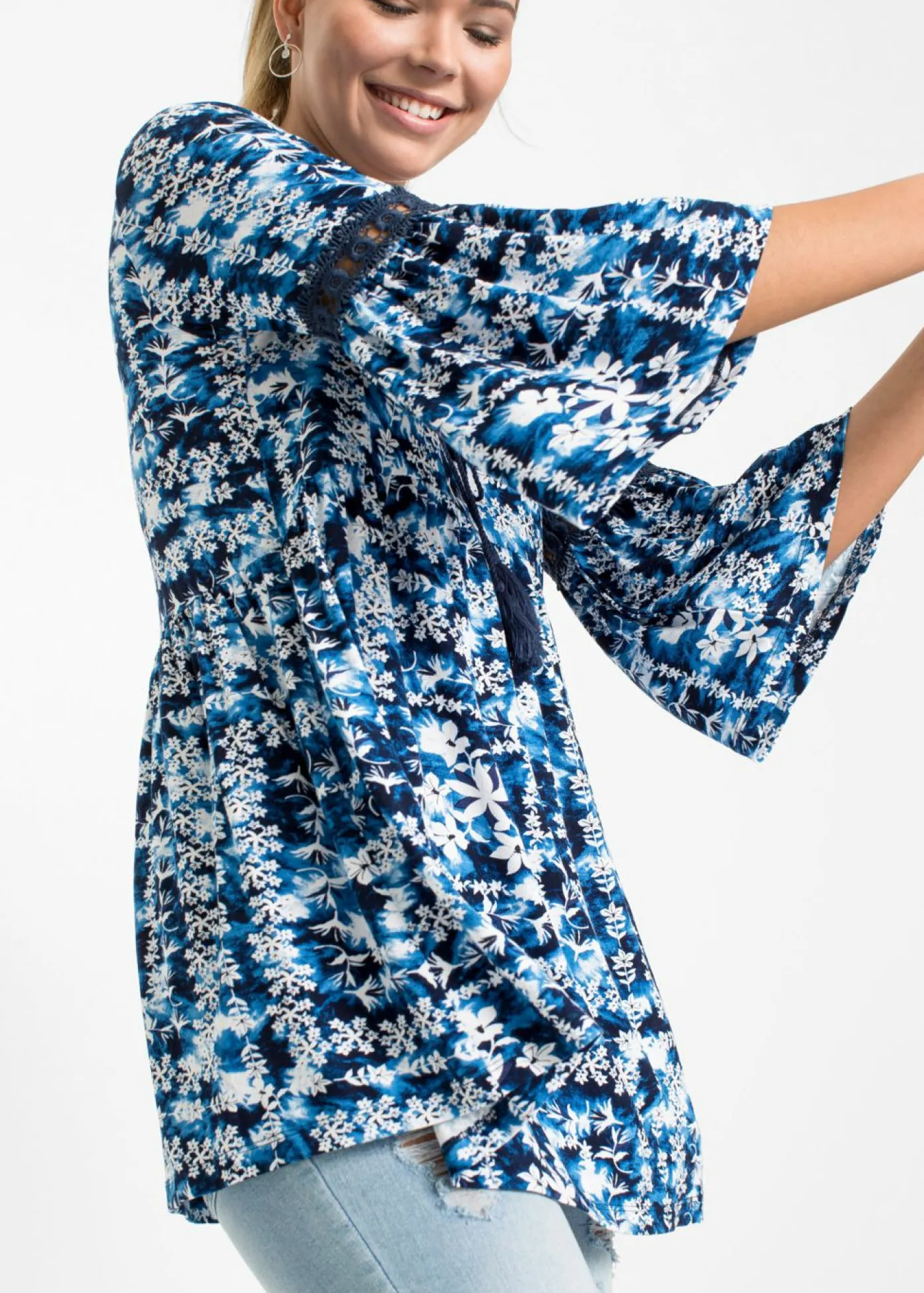 Blusa moderna con estampado batik y cordones en el escote. Largo de aprox. 74 cm en talla 40/42.