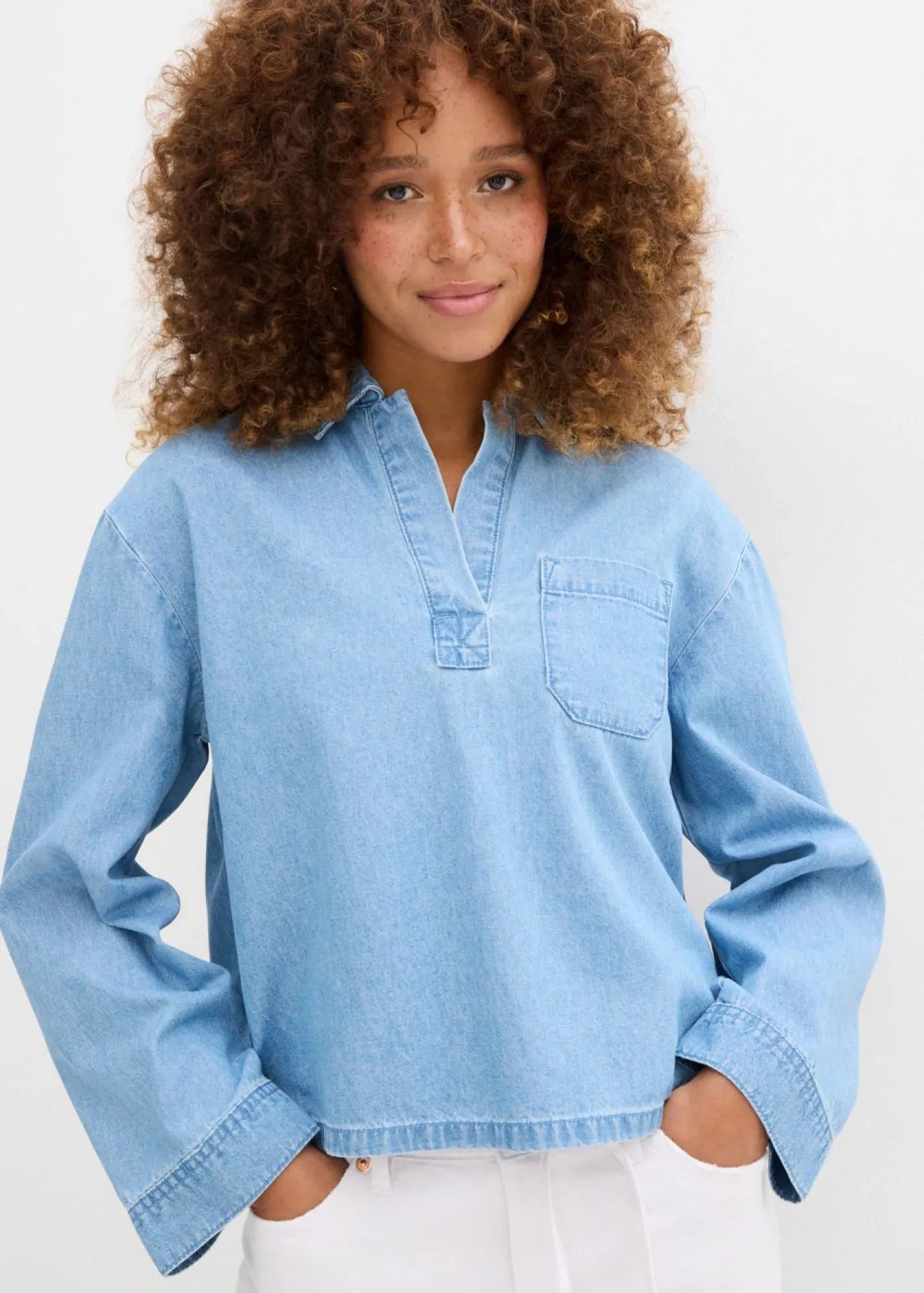 Túnica vaquera holgada con bolsillo. Largo total de aprox. 58 cm en talla 42. Se puede lavar a máquina.