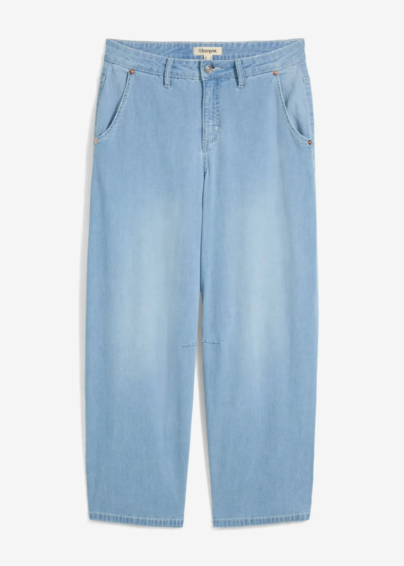 Pernera de globo acortada con talle medio. Vaqueros 5 bolsillos súper suaves, de denim ligero. Corte holgado con pernera voluminosa y redondeada desde la cadera hasta el muslo y corte cónico hacia abajo. Talle medio y pierna recortada. Largo interior de la pierna de aprox. 66,5 cm en talla 42. Se puede lavar a máquina.