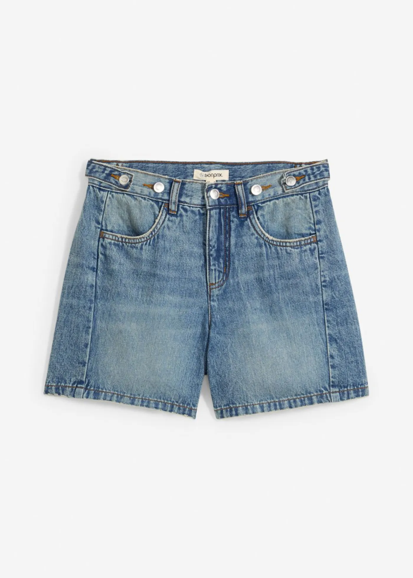 Vaqueros cortos con costura adelantada. Vaqueros cortos de 5 bolsillos confeccionado en un tejido vaquero de algodón firme que se siente un poco rígido al principio y se vuelve más suave y suelto con el uso frecuente. Con talle medio y trabilla ajustable en la cintura. Largo interior de la pierna de aprox. 16,5 cm en talla 42. Se puede lavar a máquina.