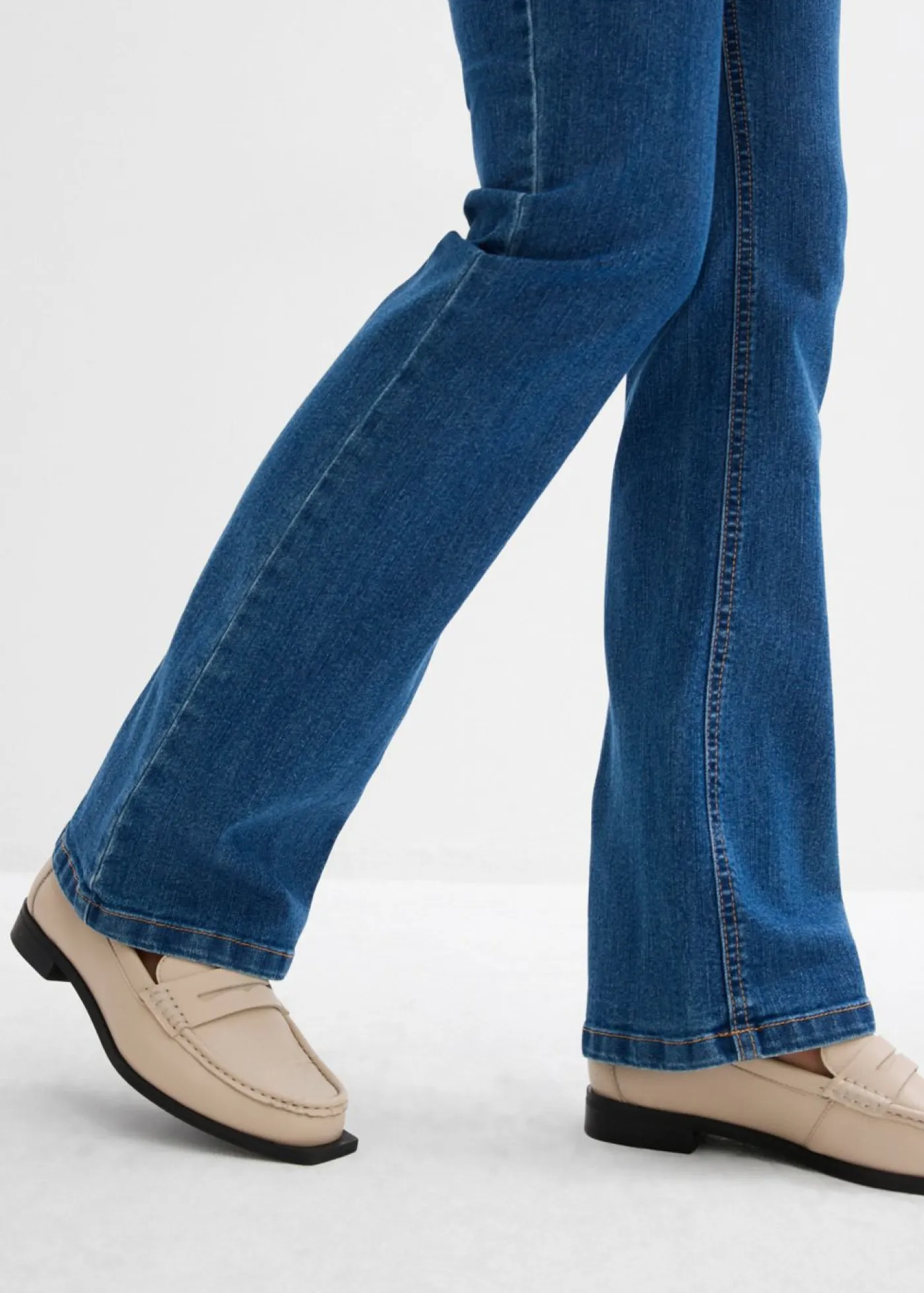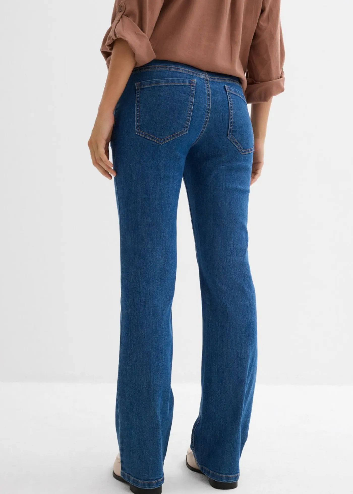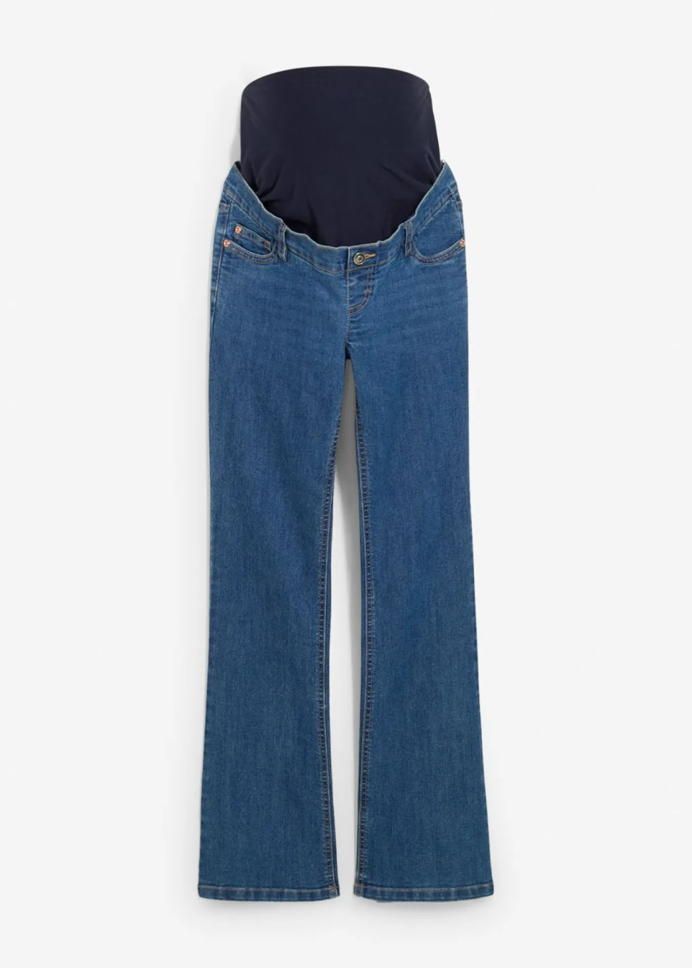 Cómodos vaqueros premamá con perneras ligeramente acampanadas. Vaqueros de 5 bolsillos de denim de algodón elástico para un ajuste cómodo. Ajuste cómodo con pernera ligeramente acampanada. La cinturilla de punto ancha de algodón asegura un ajuste óptimo al vientre. Un elástico ajustable en la cintura del pantalón permite regular la anchura, por lo que el pantalón se puede adaptar al mes de embarazo correspondiente.